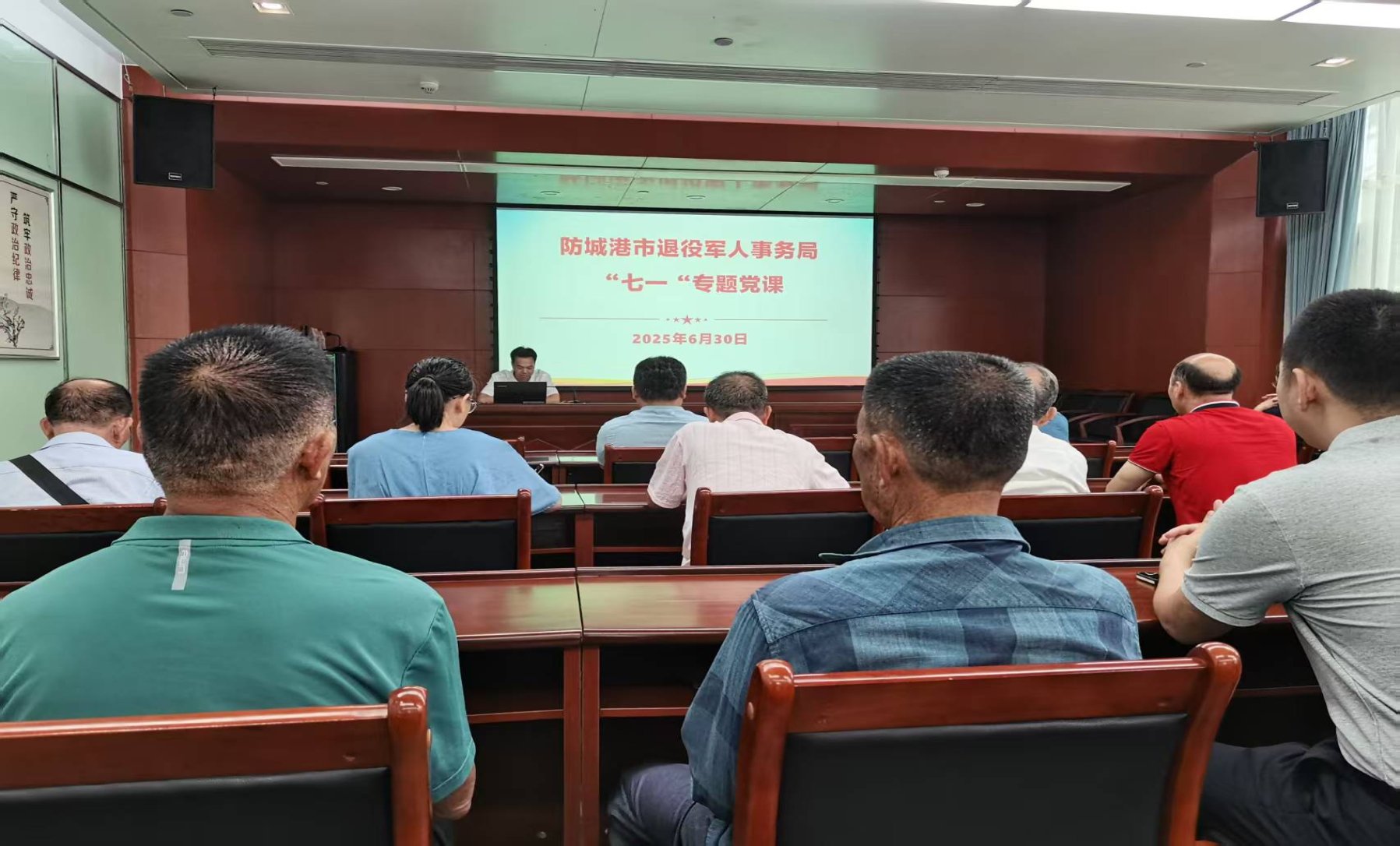 为庆祝中国共产党成立104周年,深入学习贯彻习近平新时代中国特色社会主义思想,深化中央八项规定精神落实,6月30日,防城港市军休所与主管局党支部联合开展“迎七一”系列主题活动,通过专题党课、廉政教育、红色观影等形式,进一步强化党性修养,筑牢廉洁防线。