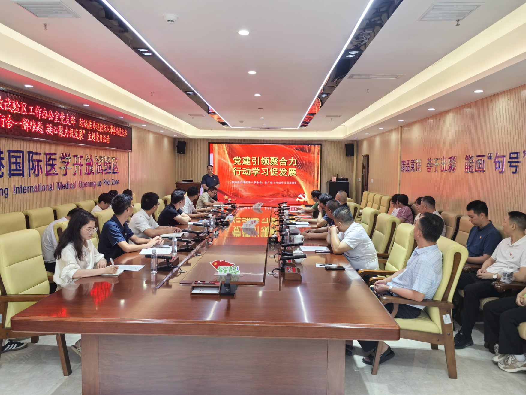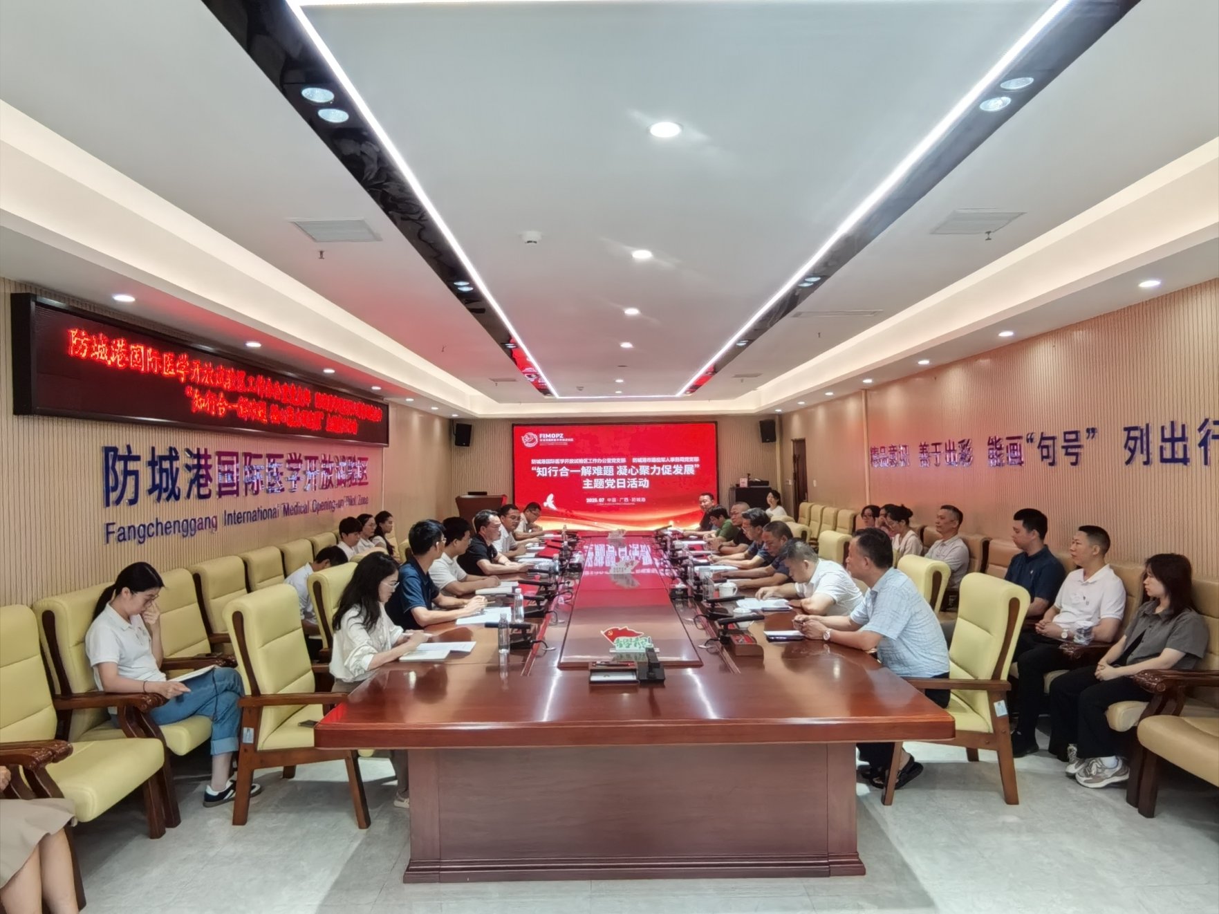 为深入学习贯彻习近平新时代中国特色社会主义思想和党的二十大精神二中、三中全会精神,推动党建与业务深度融合,7月11日上午,防城港市退役军人事务局党支部与防城港国际医学开放试验区办公室党支部联合开展“知行合一解难题 凝心聚力促发展”主题党日活动,近30名党员同志共同参与,以实干行动为医学试验区建设注入红色动力。