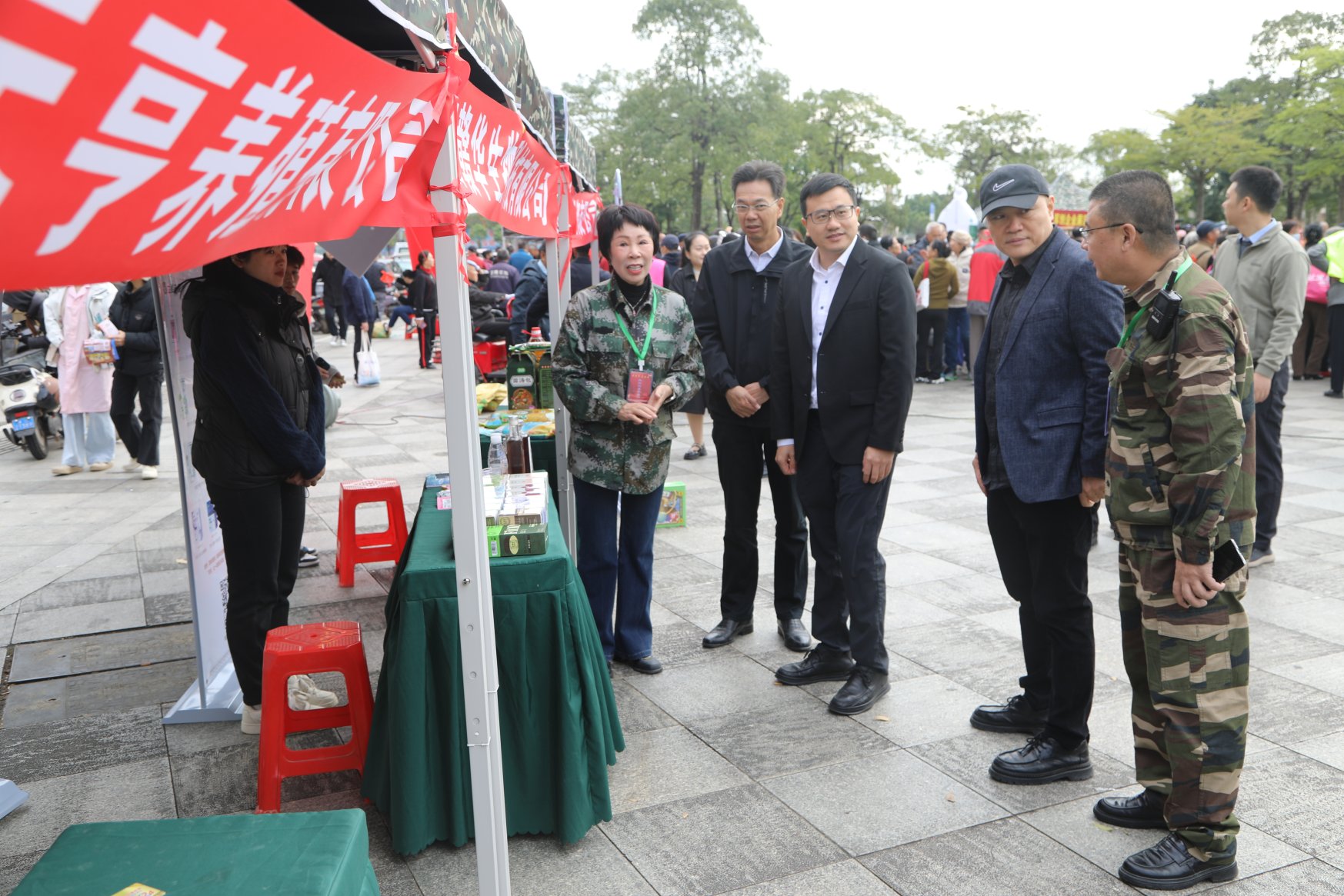 与此同时,白鹭公园的展销区人潮如织。40个标准展位整齐排列,陈列着琳琅满目的军创产品:从香气扑鼻的农特干货、匠心独运的手工艺品,到科技感十足的智能设备、贴近生活的文创周边,每一件展品都凝聚着退役军人的创业心血。