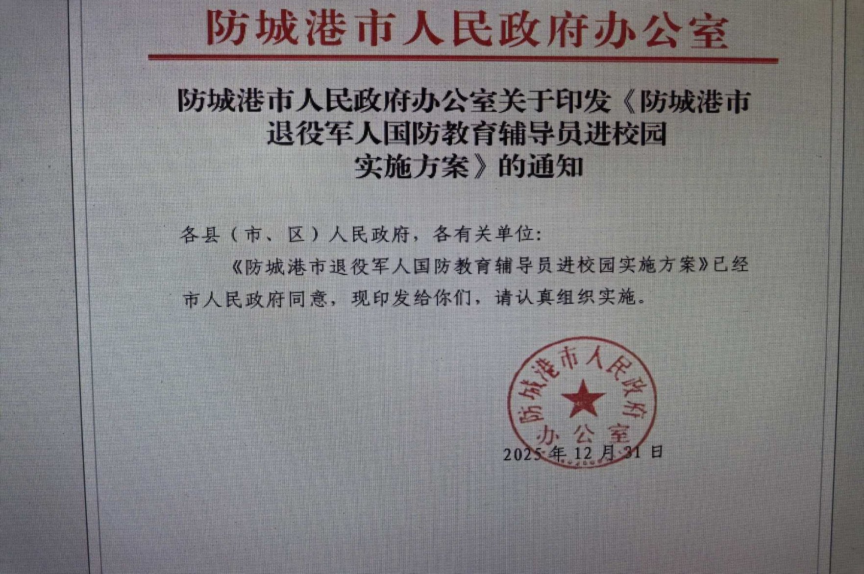 2025年12月31日,防城港市人民政府正式印发《防城港市退役军人国防教育辅导员进校园实施方案》,标志着这项创新性国防教育工程全面启动。该方案由分管副市长牵头,市退役军人事务局、市教育局、防城港军分区政治工作处等5个部门协同推进,旨在通过退役军人专业力量加强青少年国防教育,同时拓宽退役军人就业渠道,构建“军地共育、校地联动”的国防教育新格局。