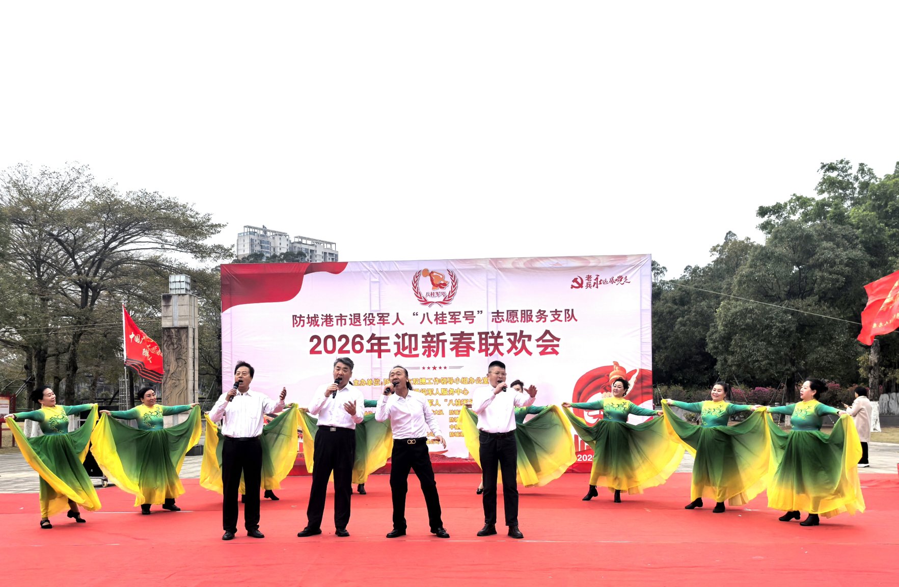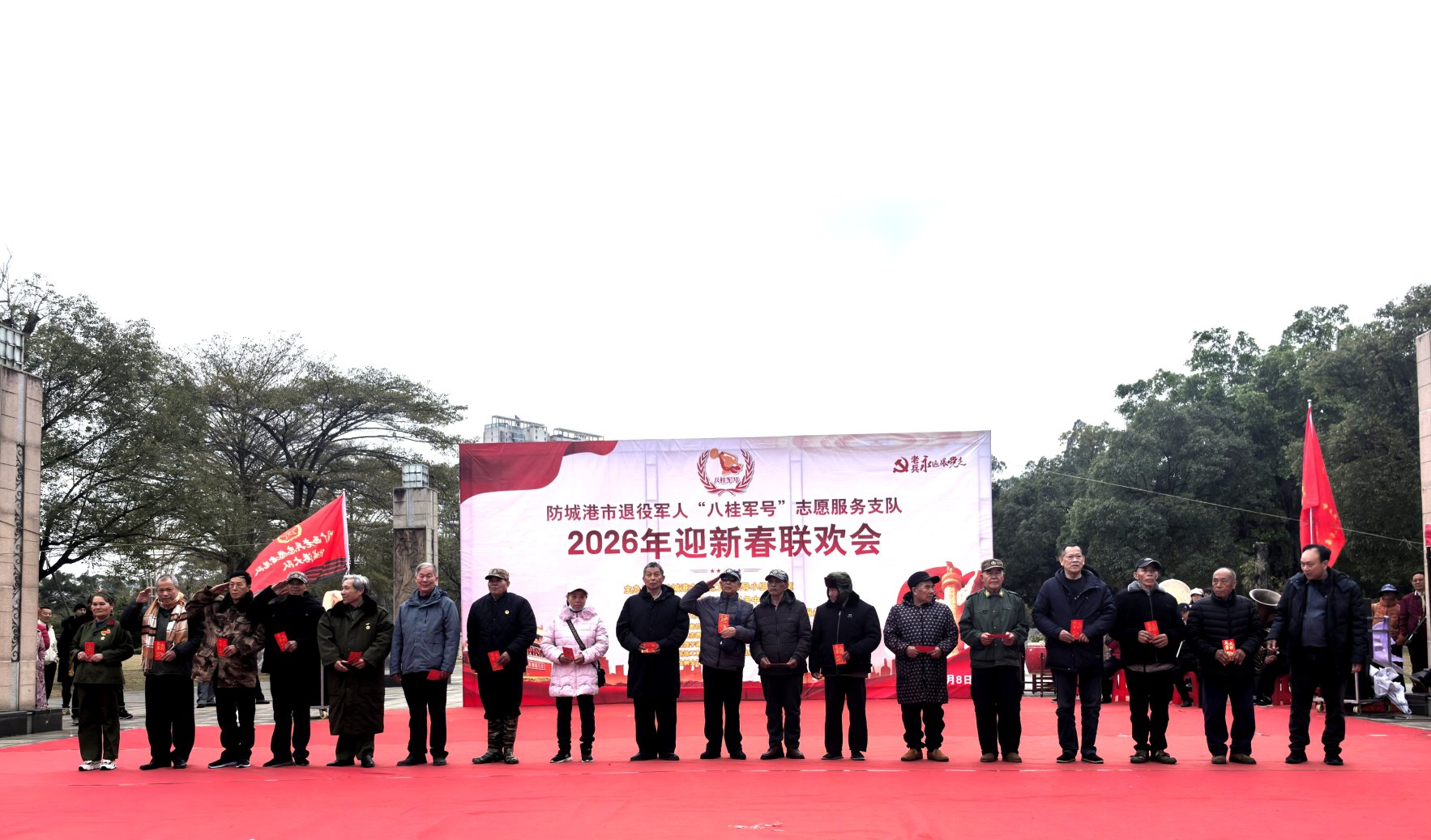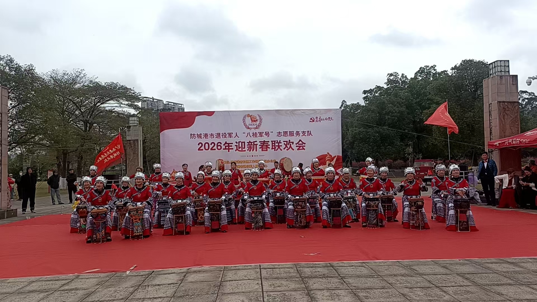 2月8日下午,白鹭公园东广场军歌嘹亮、鼓点激昂,防城港市退役军人“八桂军号”志愿服务支队2026年迎新春联欢会在《我和我的祖国》的深情合唱中拉开帷幕。市退役军人“八桂军号”志愿服务支队及防城港大队负责同志、参战老兵、伤残军人代表,与300余名志愿者和市民齐聚一堂,共同迎接新春的到来。
