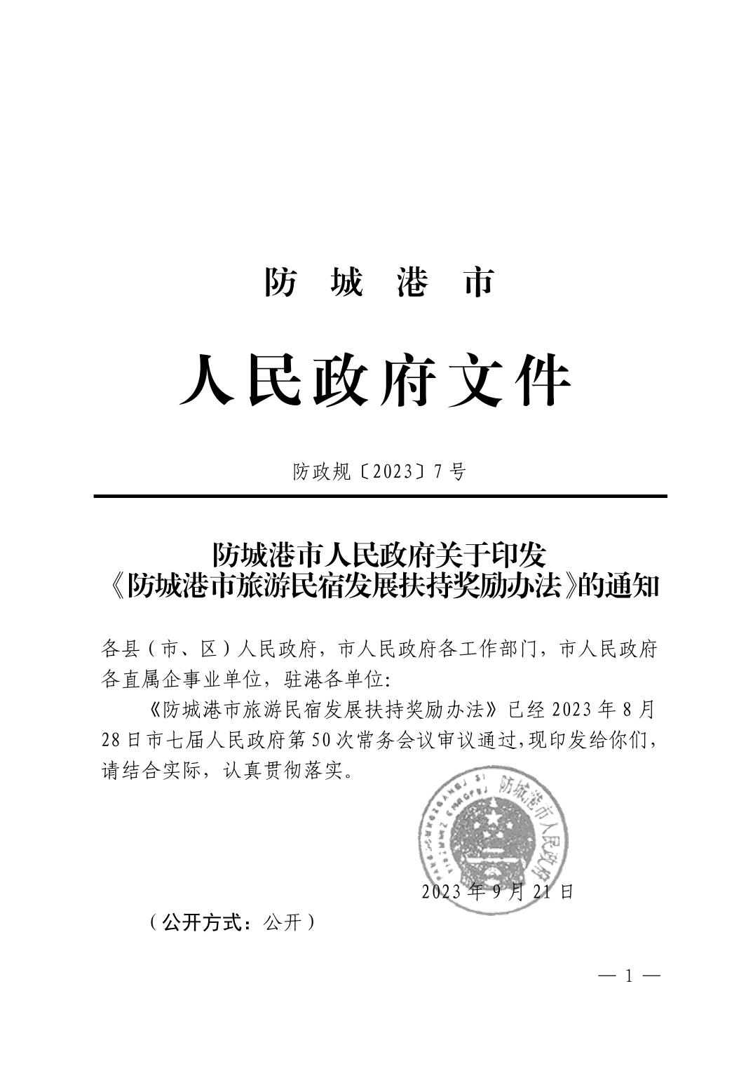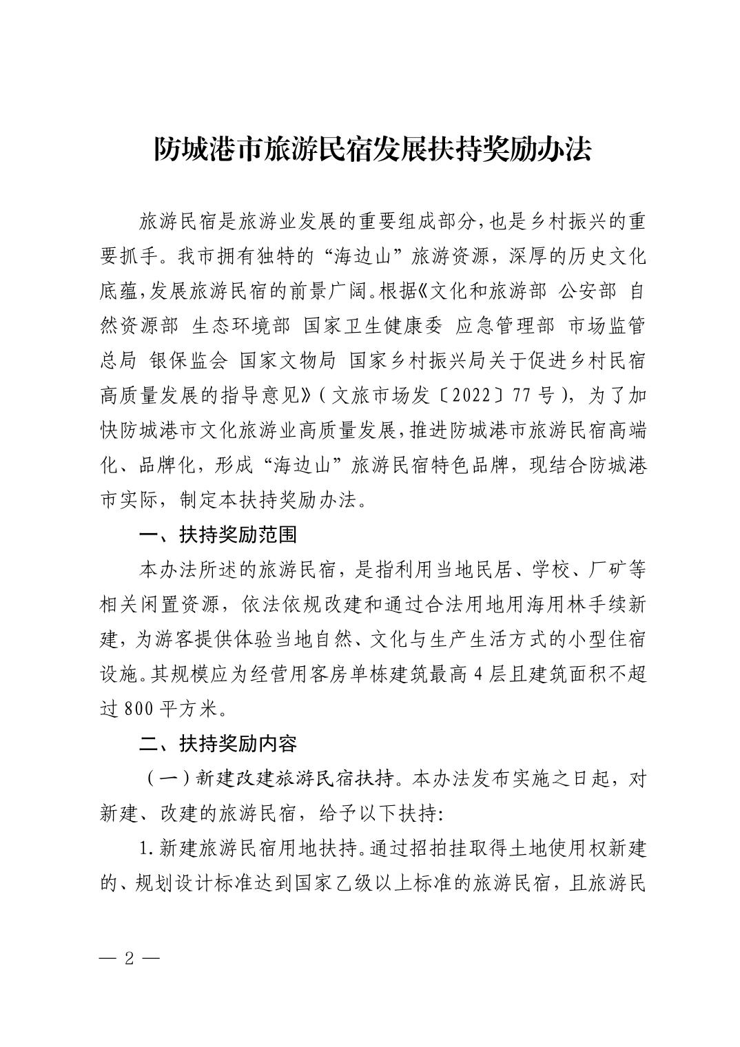 防城港市人民政府关于印发《防城港市旅游民宿发展扶持奖励办法》的通知