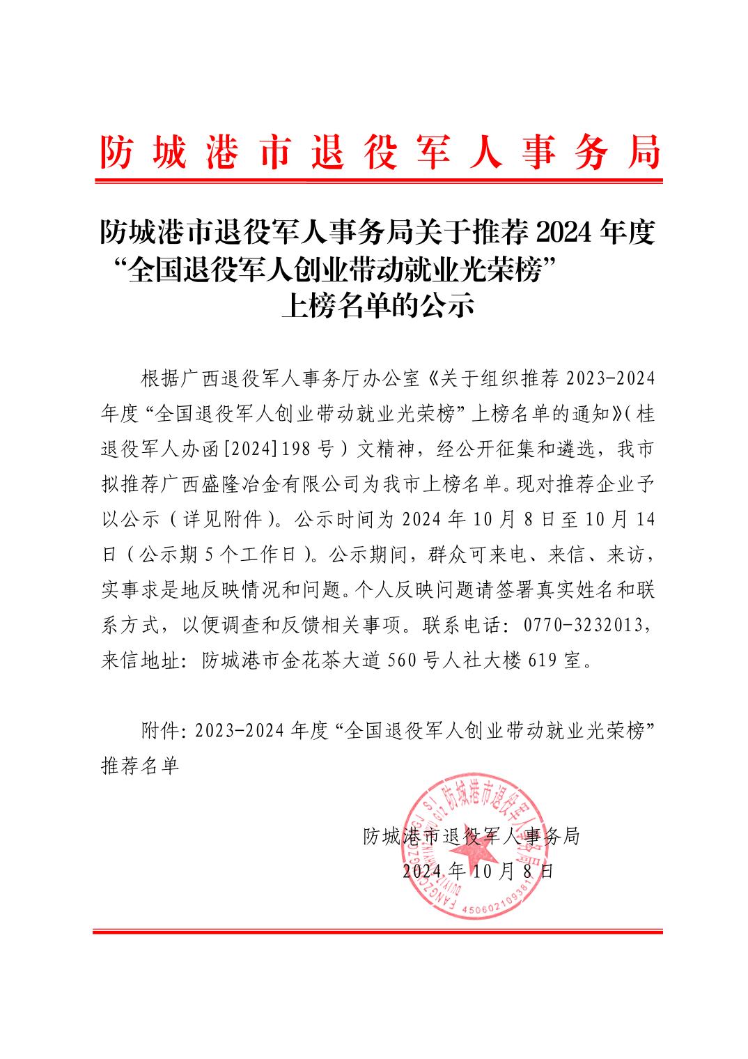 防城港市退役军人事务局关于推荐2024年度“全国退役军人创业带动就业光荣榜”上榜名单的公示