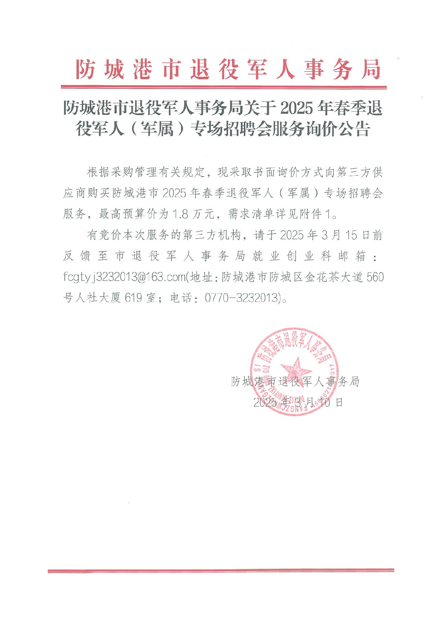 防城港市退役军人事务局关于2025年春季退役军人(军属)专场招聘会服务询价公告