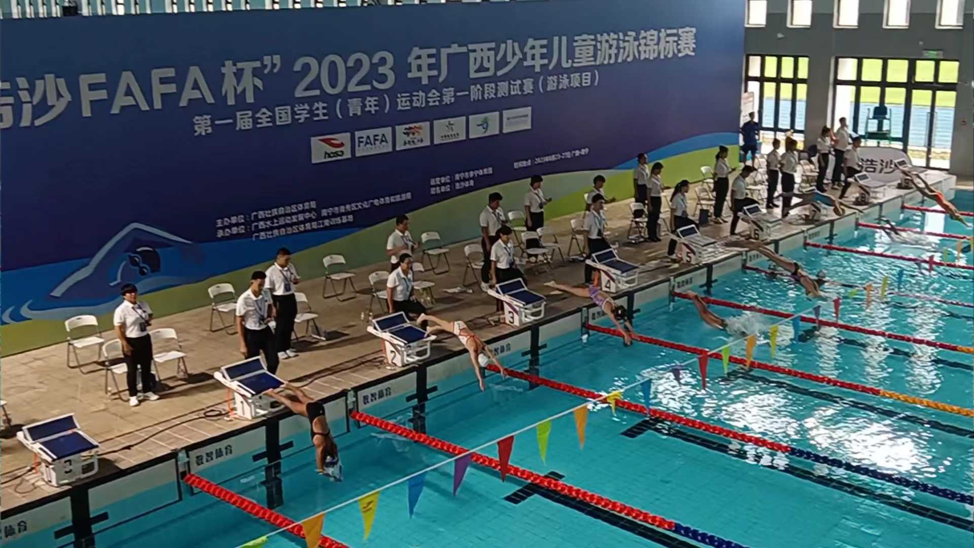 上图为我市运动员在2023年广西少年儿童游泳锦标赛比赛现场