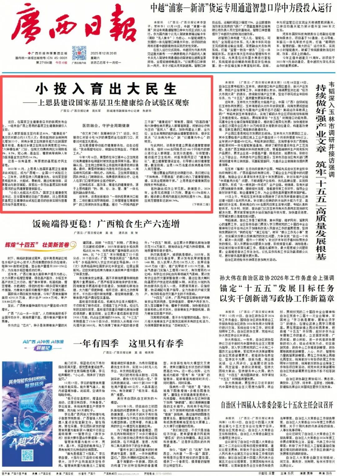 12月20日广西日报头版头条刊发有关报道。