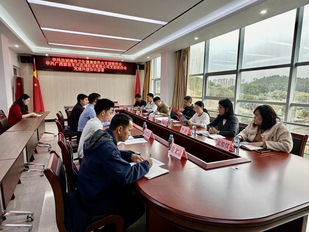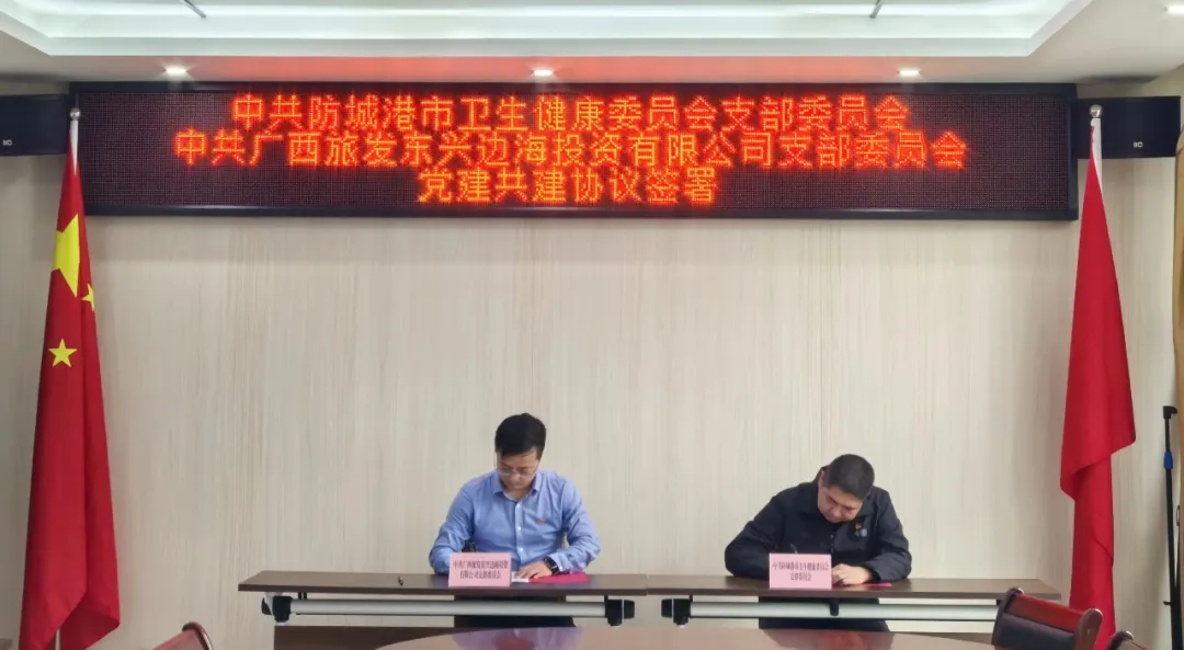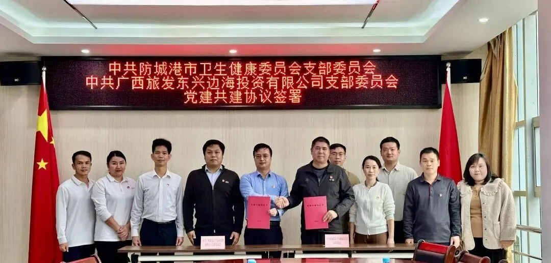 为深化政企党建联动,激活党建引领发展效能,推动卫生健康服务与边海文旅产业深度融合,12月23日,中共防城港市卫生健康委员会支部委员会与中共广西旅发东兴边海投资有限公司支部委员会举行党建共建签约仪式。市卫生健康委党组书记、主任戴三军,广旅防城港投资公司党委副书记、总经理,东兴投资公司党支部书记、董事长张锋出席签约仪式。