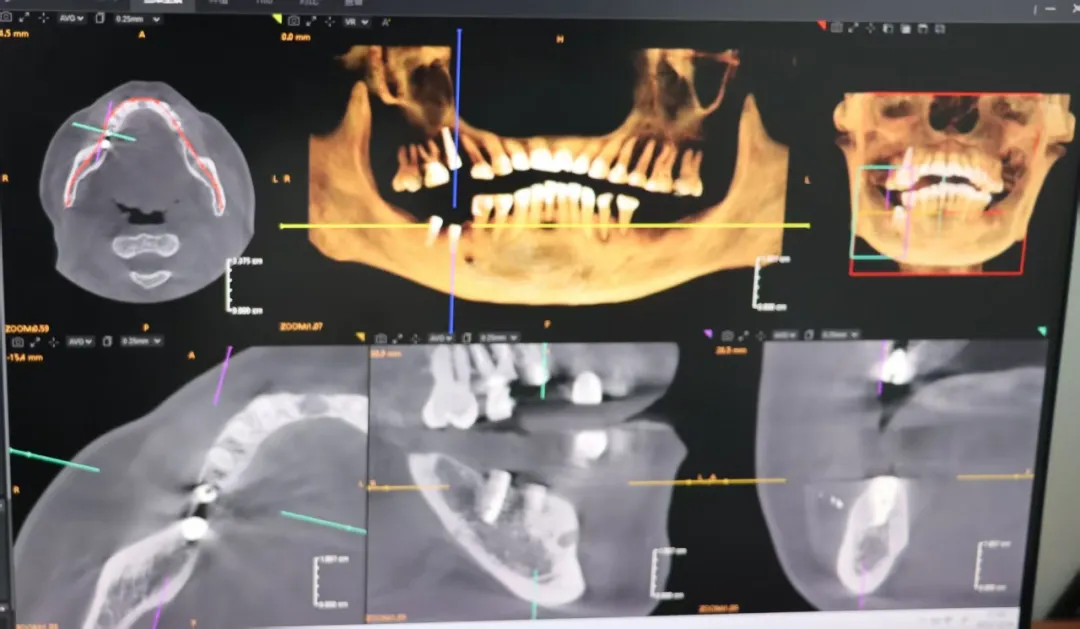 患者因右上下后牙缺失两年,影响咀嚼功能与生活质量。为彻底解决这一问题,患者到该院口腔科就诊。接诊医生进行了细致的口腔检查,并结合医院引进的先进口腔CT影像设备进行了全面评估。该设备能提供三维立体影像,清晰显示牙槽骨的高度、宽度、密度以及重要解剖结构的位置,为制定精准、安全的种植方案提供了关键依据。