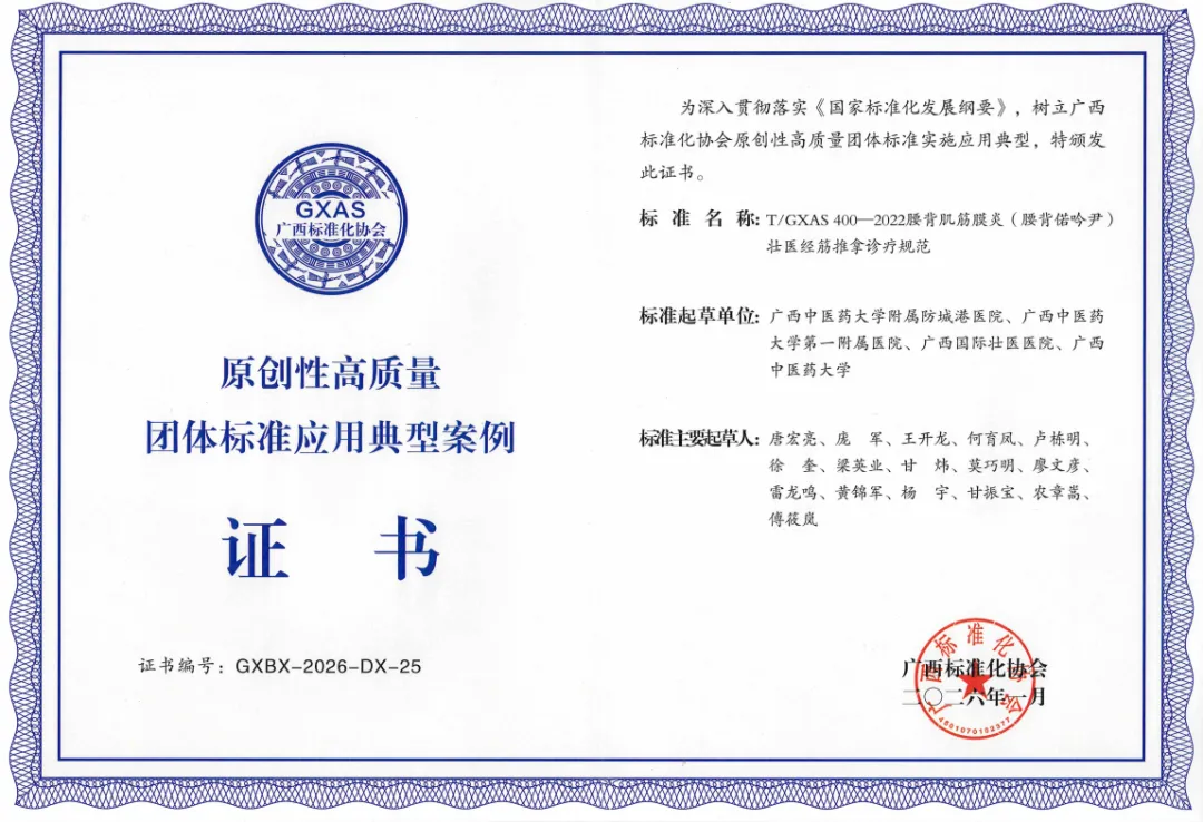 近日,广西标准化协会发布了第一批100项标准实施应用典型案例名单。由防城港市中医医院院长唐宏亮教授主导制定的两项团体标准——T/GXAS400-2022《腰背肌筋膜炎(腰背偌尹)壮医经筋推拿诊疗规范》与T/GXAS398-2022《肩周炎(旁巴尹)壮医经筋推拿诊疗规范》,成功入选“原创性高质量团体标准实施应用典型案例”。