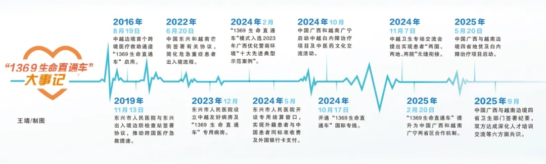 “1369生命直通车”正是这宏大叙事中,一块坚实而温暖的民生基石。如今,“1369生命直通车”持续升级,国际专线电话已分别在东兴和芒街的医院启用,未来还将实现救护车直接点到点开到对方医院转运患者。