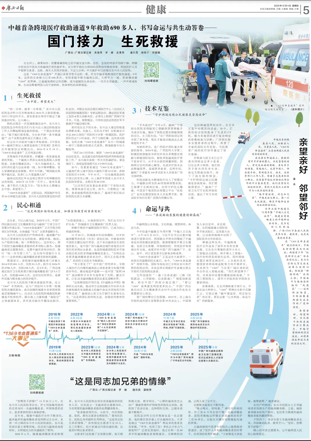 中越关系的根基在人民、血脉在人民、力量在人民。“1369生命直通车”正是由两国人民共同书写的传奇。