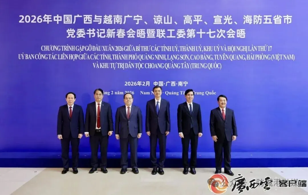 会晤中,各方共同签署《2026年中国广西与越南广宁、谅山、高平、宣光、海防五省市党委书记新春会晤纪要》等合作文件。各方还举行了中国广西与越南五省市联工委第十七次会晤,进一步推进落实党委书记新春会晤达成的合作共识。中国广西与越南广宁共同启动中国东兴—越南芒街智慧口岸项目建设。
