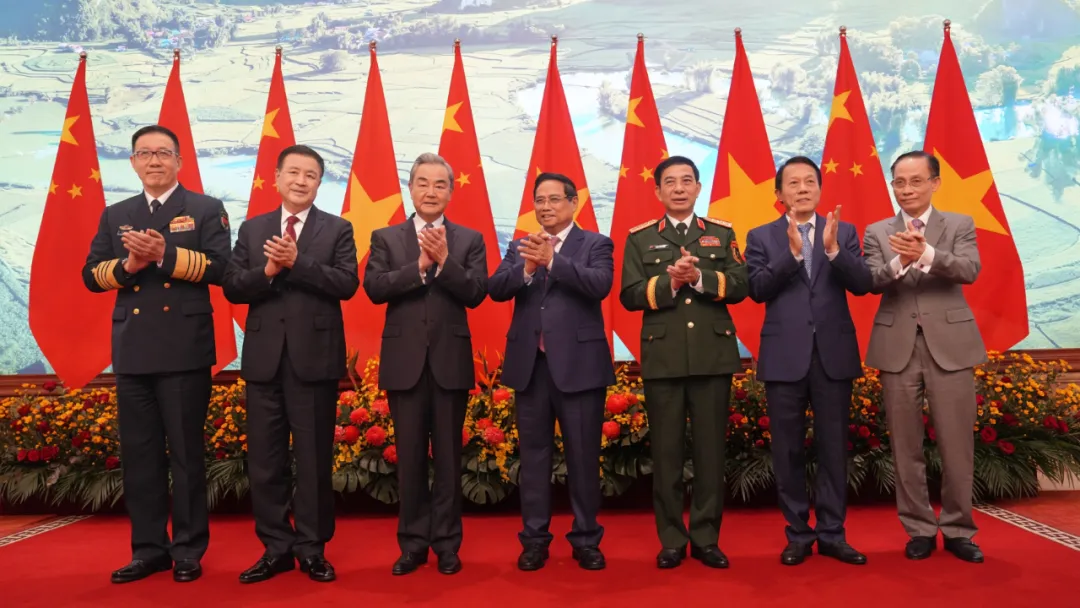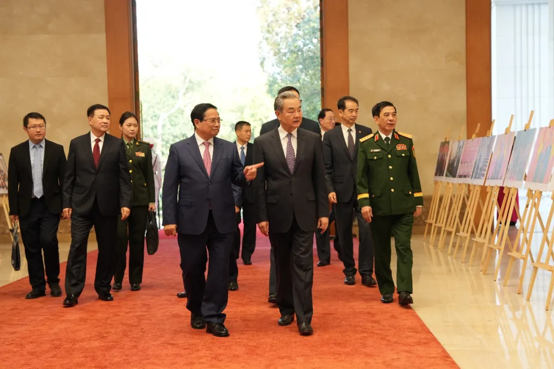 王毅首先转达中方领导人的亲切问候,表示去年4月习近平总书记、国家主席访越以来,中越全方位合作驶入快车道,充分表明两党两国关系发展具有强大内生动力和光明前景。今年越共十四大后,两党最高领导人及时通话,就深化中越命运共同体建设达成重要共识。今天上午,由两党最高领导人共同决策的“3+3”战略对话机制首次部长级会议成功召开。这是中越在全球建立的首个“3+3”机制,充分彰显了两党两国关系的高水平和战略性。
