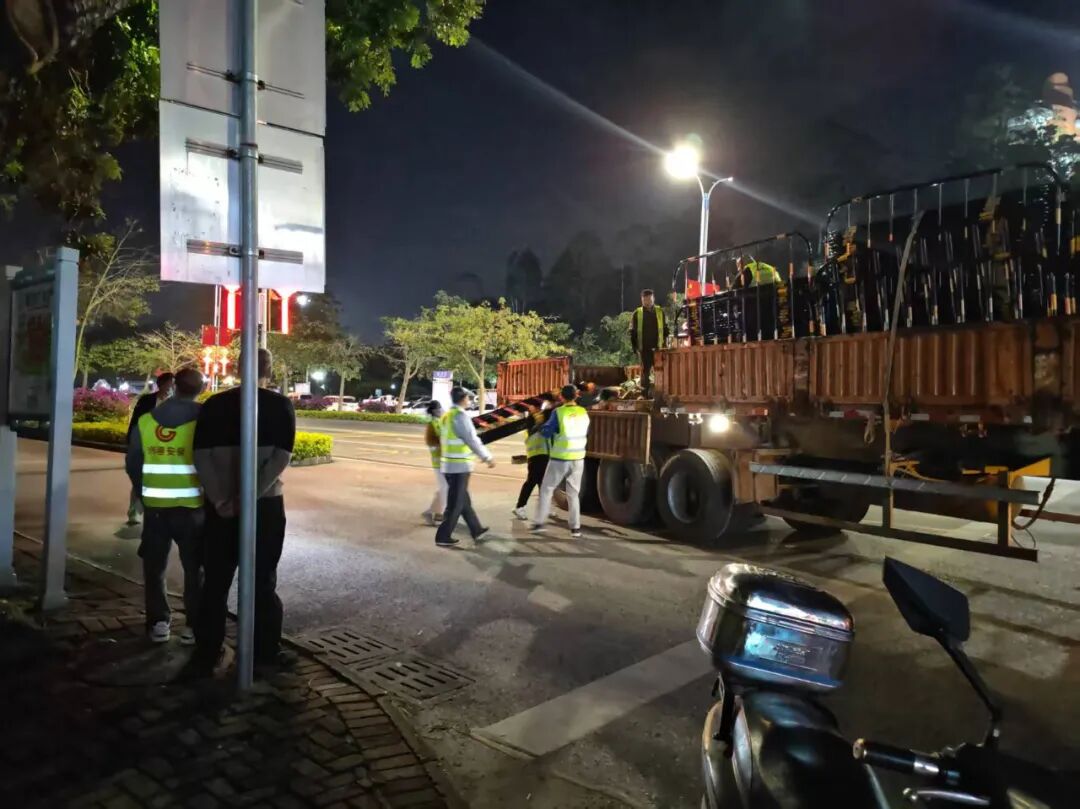 凌晨五点的防城港,天色未亮,兴港集团工作团队的队员们已经开始忙碌。他们负责的铁马水马摆放工作必须在六点半交通管制前全部完成。