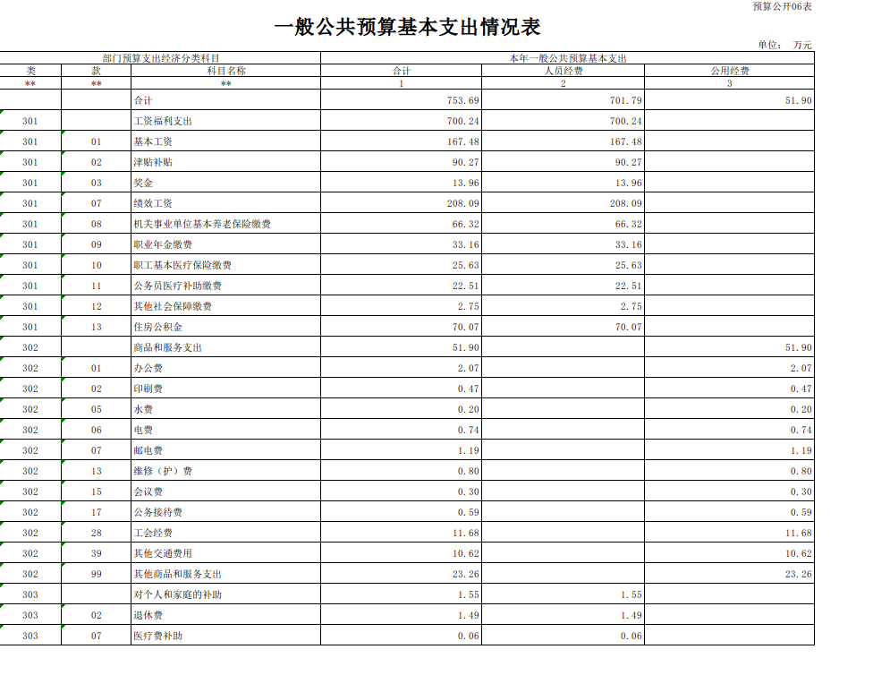 301工资福利支出700.24万元,其中:基本工资167.48万元、津贴补贴90.27万元、奖金13.96万元、绩效工资208.09万元、机关事业单位基本养老保险缴费66.32万元、职业年金缴费33.16万元,职工基本医疗保险缴费25.63万元、公务员医疗补助缴费22.51万元、其他社会保障缴费2.75万元、住房公积金70.07万元。