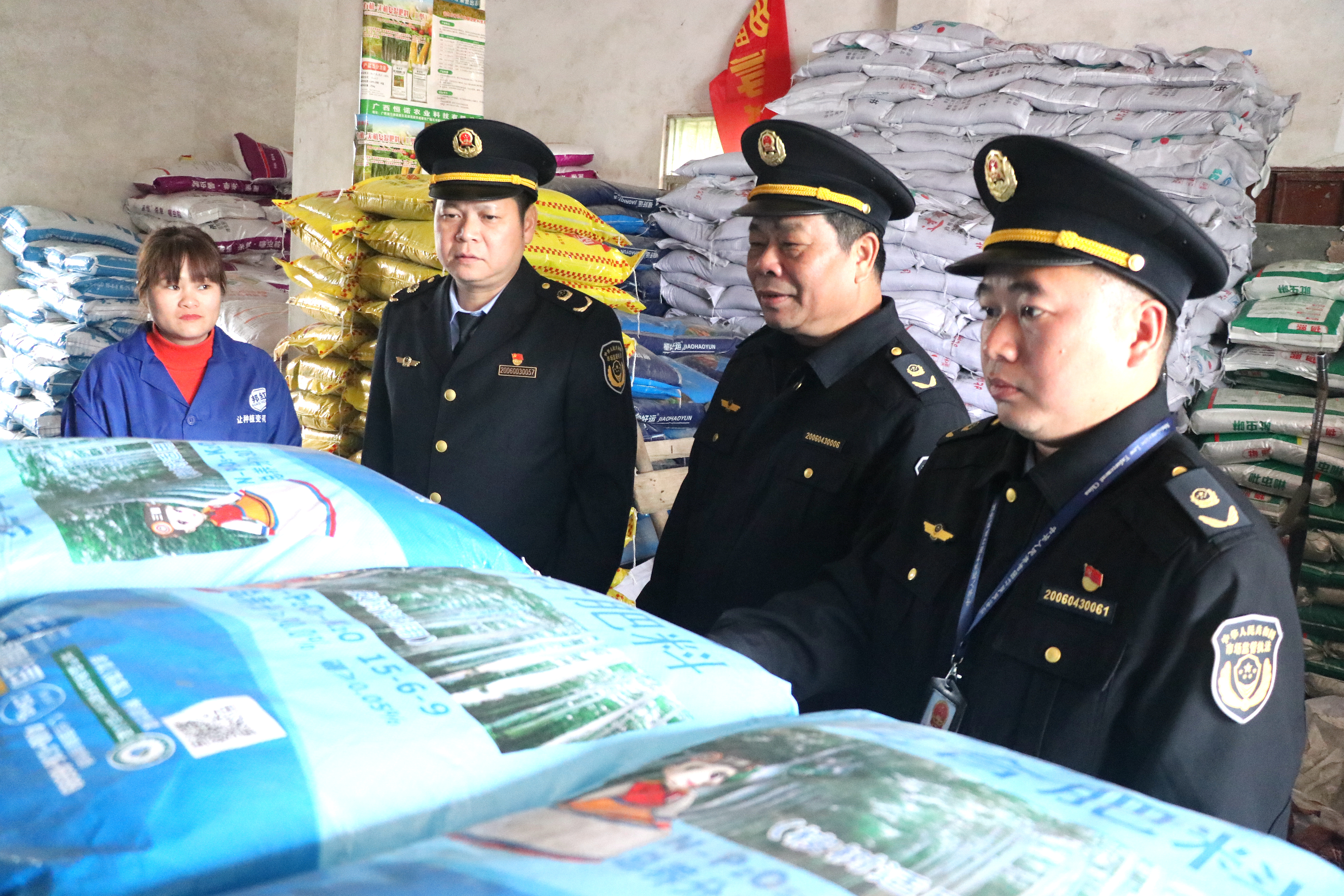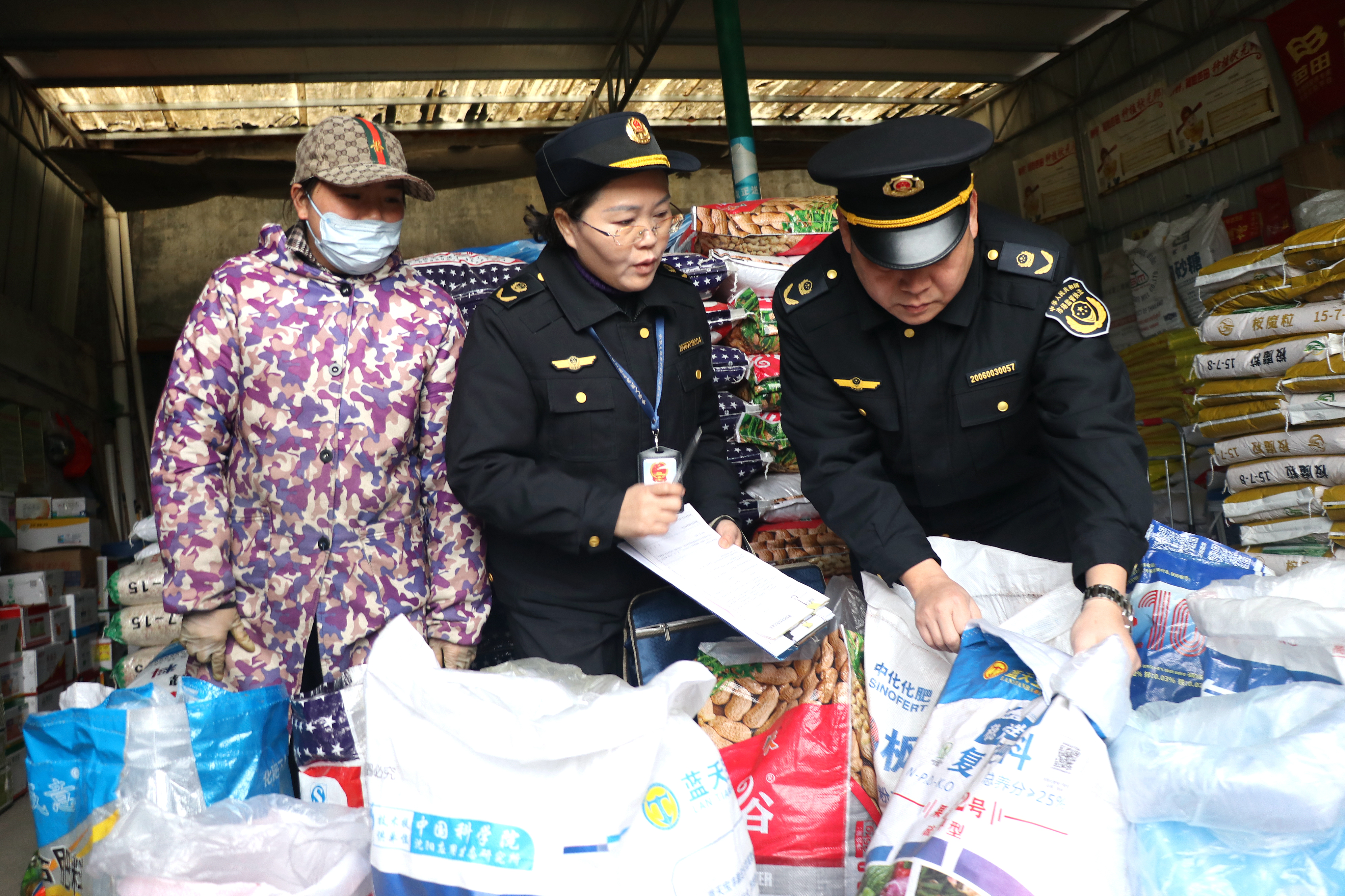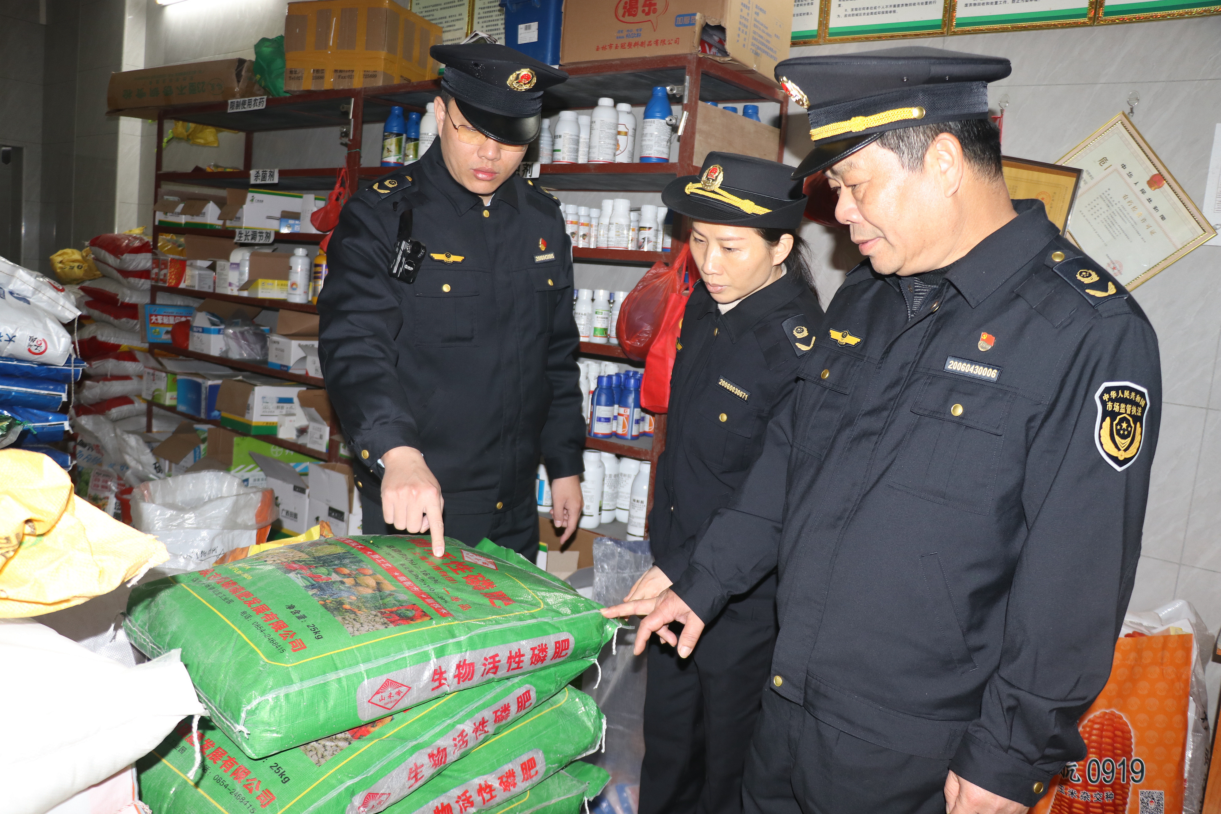 执法人员在检查化肥经营店