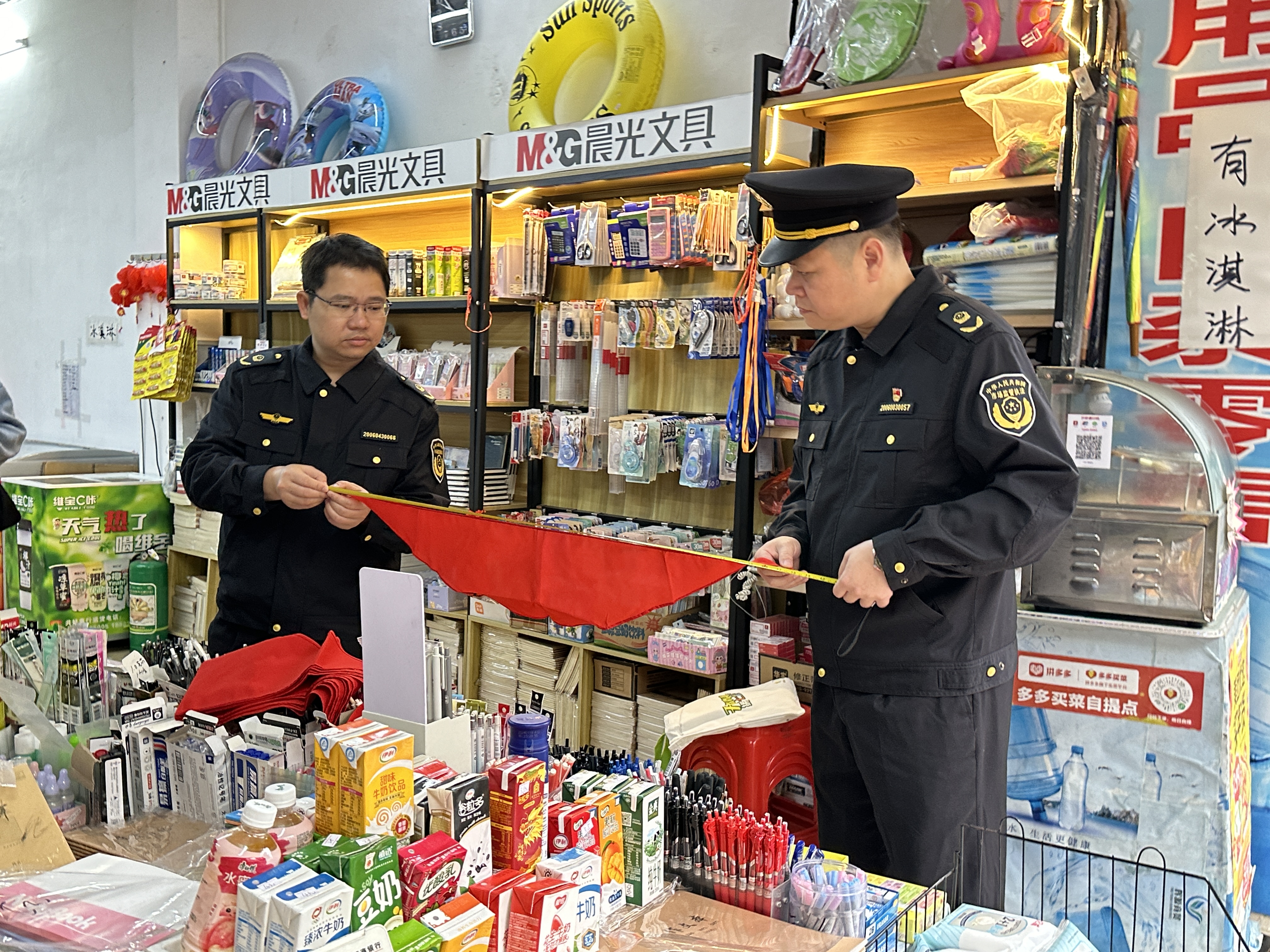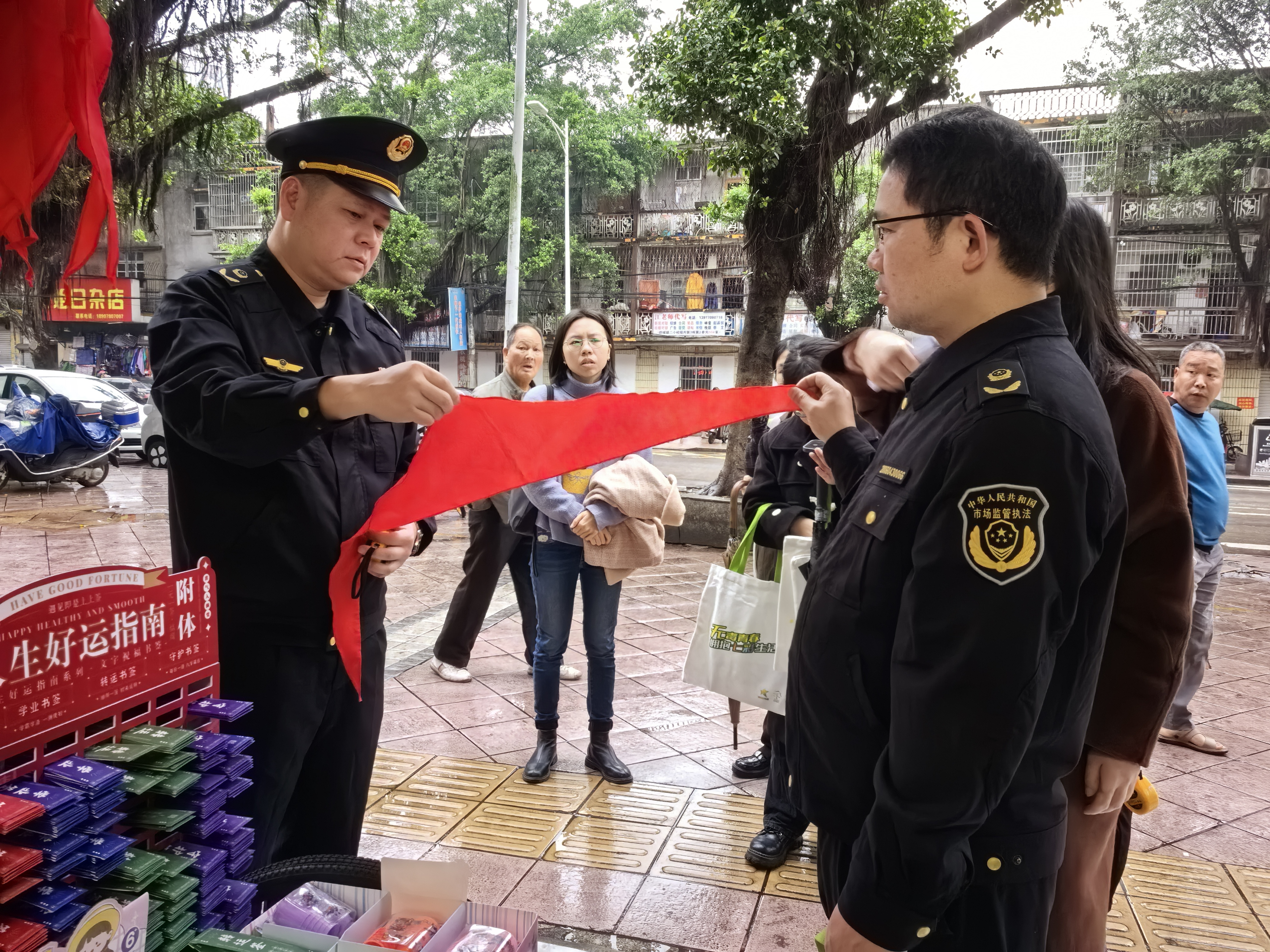 为确保全市校园周边文化市场安全有序,加强对少先队标志标识的保护,维护其规范性、统一性、严肃性,增强少先队员光荣感,保护少年儿童健康成长。根据《关于加强红领巾等少先队标志标识规范和保护工作的通知》文件精神以及防城港市“扫黄打非”相关工作部署要求,3月15日,防城港市市场监管局联合团市委、防城团区委开展少先队标志标识专项排查整治行动,对防城区部分小学周边文体商户开展清查整治行动,重点查看售卖的红领巾、队旗、队徽等少先队标志标识是否合规。