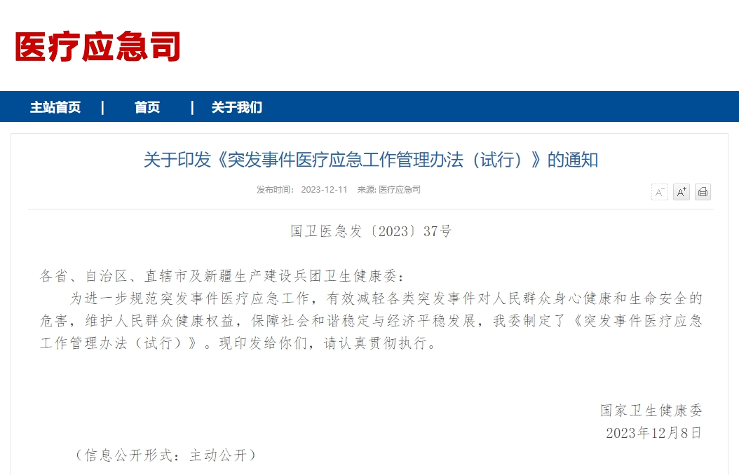 国家卫生健康委发布《突发事件医疗应急工作管理办法(试行)》(附解读)