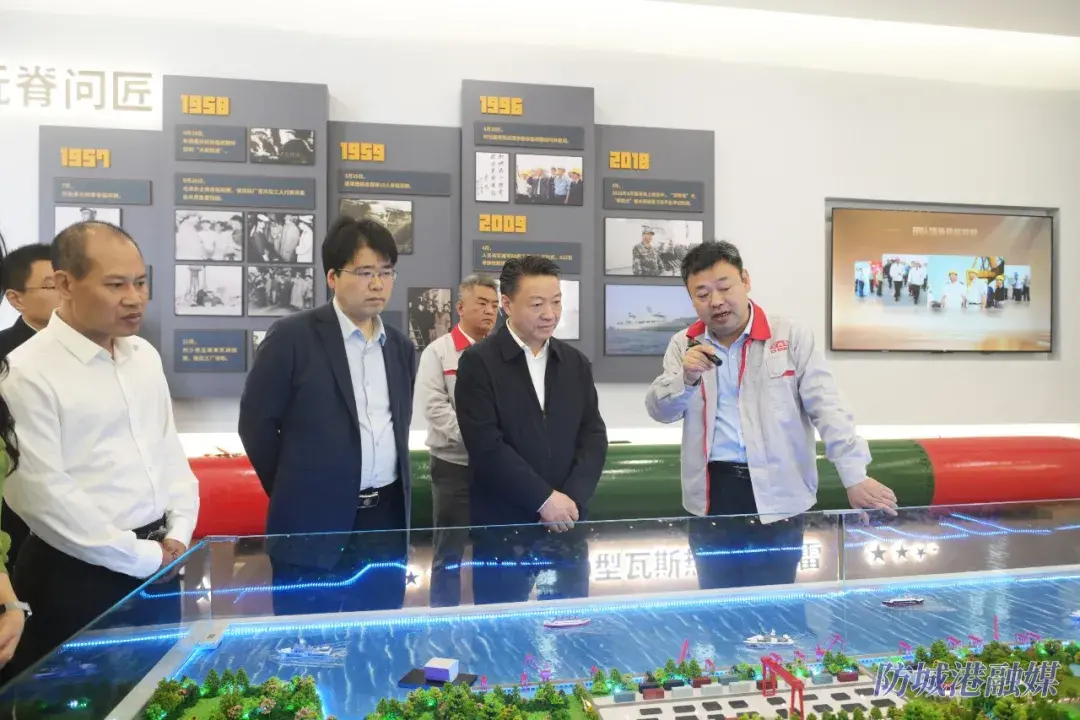 在芜湖造船厂有限公司,邱明宏一行参观厂史馆,深入船舶建造现场了解生产工艺与建设进度,并与芜湖市副市长曹小明,芜湖造船厂党委书记、董事长张钊,三点水新能源科技(安徽)有限公司董事长郑天保座谈。邱明宏介绍了防城港市经济社会发展成效、临港产业布局及造船产业发展优势,指出防城港市正深入贯彻党的二十大和二十届历次全会精神、全国两会精神,以及习近平总书记关于区域协调发展、构建新发展格局的重要论述,扎实推进“3+2”工作,加快构建“3+4+N”现代化临港产业体系,经济社会保持向优向新发展态势,为“十五五”良好开局筑牢基础。他希望两地建立常态化战略合作机制,聚焦绿色智能船舶制造、船舶维修保养、临港装备配套等重点领域深化合作,共同开拓东盟市场,实现更高水平互利共赢。曹小明、张钊、郑天保对防城港市代表团表示欢迎,分别介绍芜湖市发展情况及企业运营状况,表示将加强沟通对接,深挖合作潜力,携手打造面向东盟的产业协作新平台。