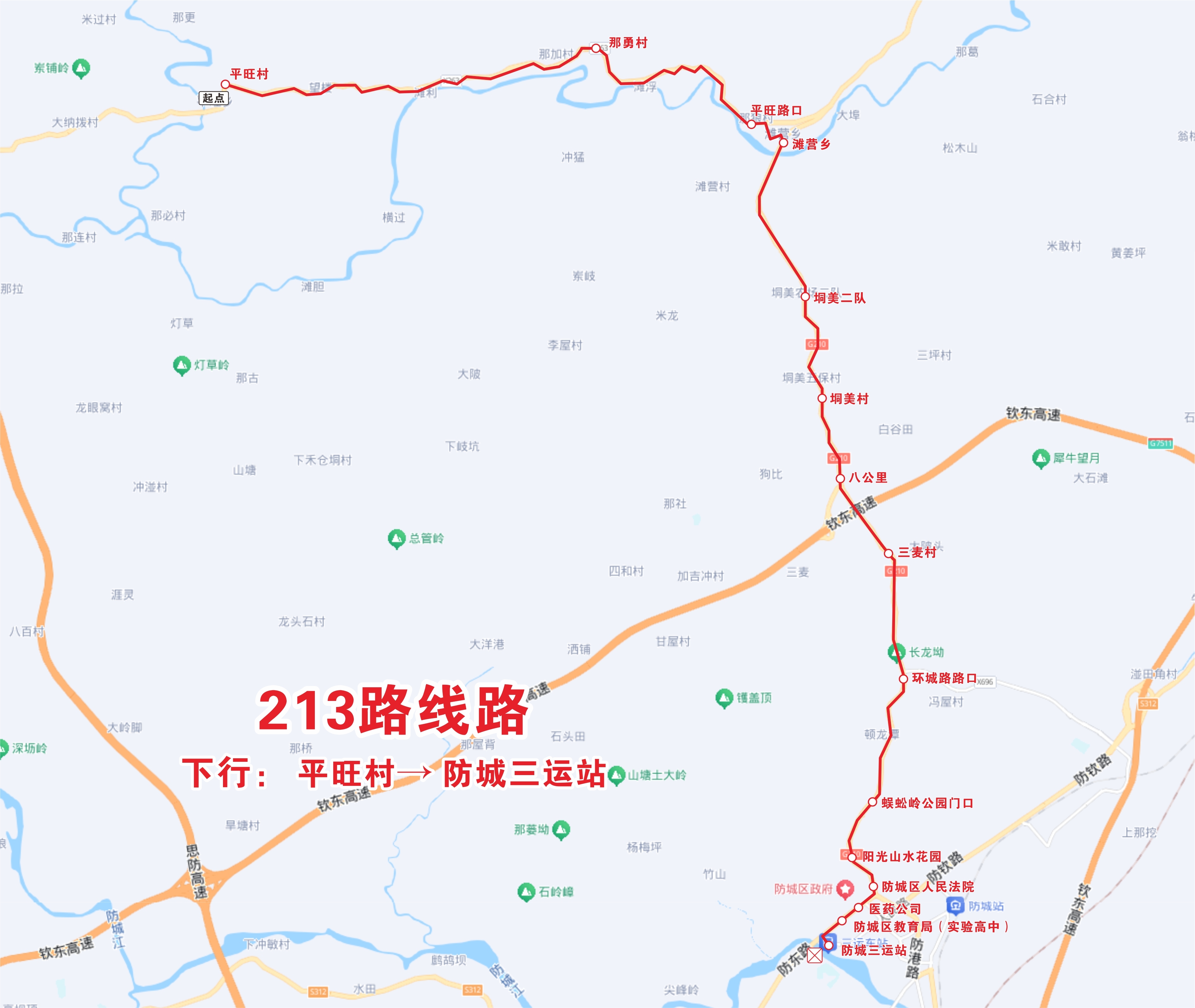 防城区三运站→防城区第→市场→医药公司→防城区法院→阳光山水花园→蜈蚣岭公园→环城路路口→三麦村→八公里→垌美村→垌美二队→滩营乡→平旺路口→那勇村→平旺村 |