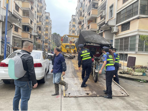 ▲对那里蒙廉租房小区内“僵尸车”进行清理。