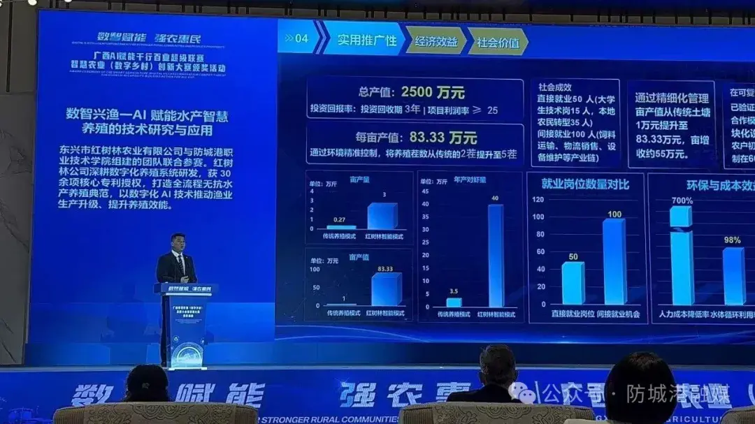 在今年广西智慧农业(数字乡村)创新大赛专业赛道决赛中,红树林农业团队的“数智兴渔——AI赋能水产智慧养殖的技术研究与应用”荣获三等奖,并代表专业赛道组向大赛路演,推介智慧养虾经验。