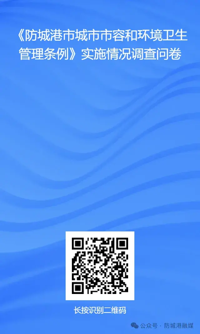 请使用微信扫描下方二维码,通过以下调查问卷链接反馈意见,反馈内容将作为《防城港市城市市容和环境卫生管理条例》立法后评估工作的重要参考依据,期待您根据实际情况进行填写,组织方将依法对本次问卷调研的结果及相关信息严格保密。