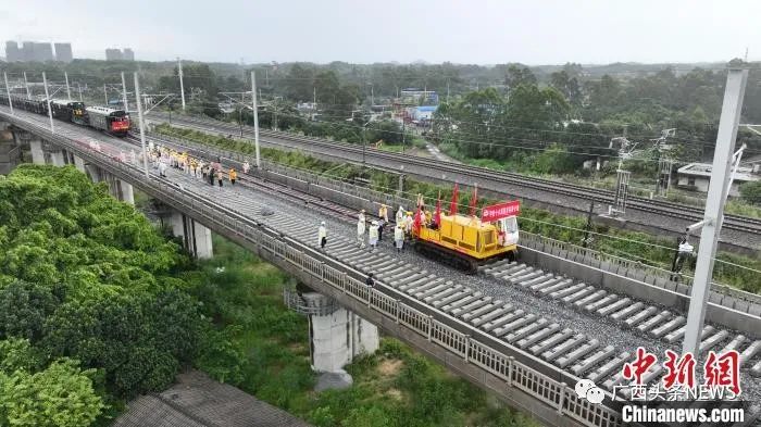 资料图为防东铁路铺轨现场航拍。陈磊 摄