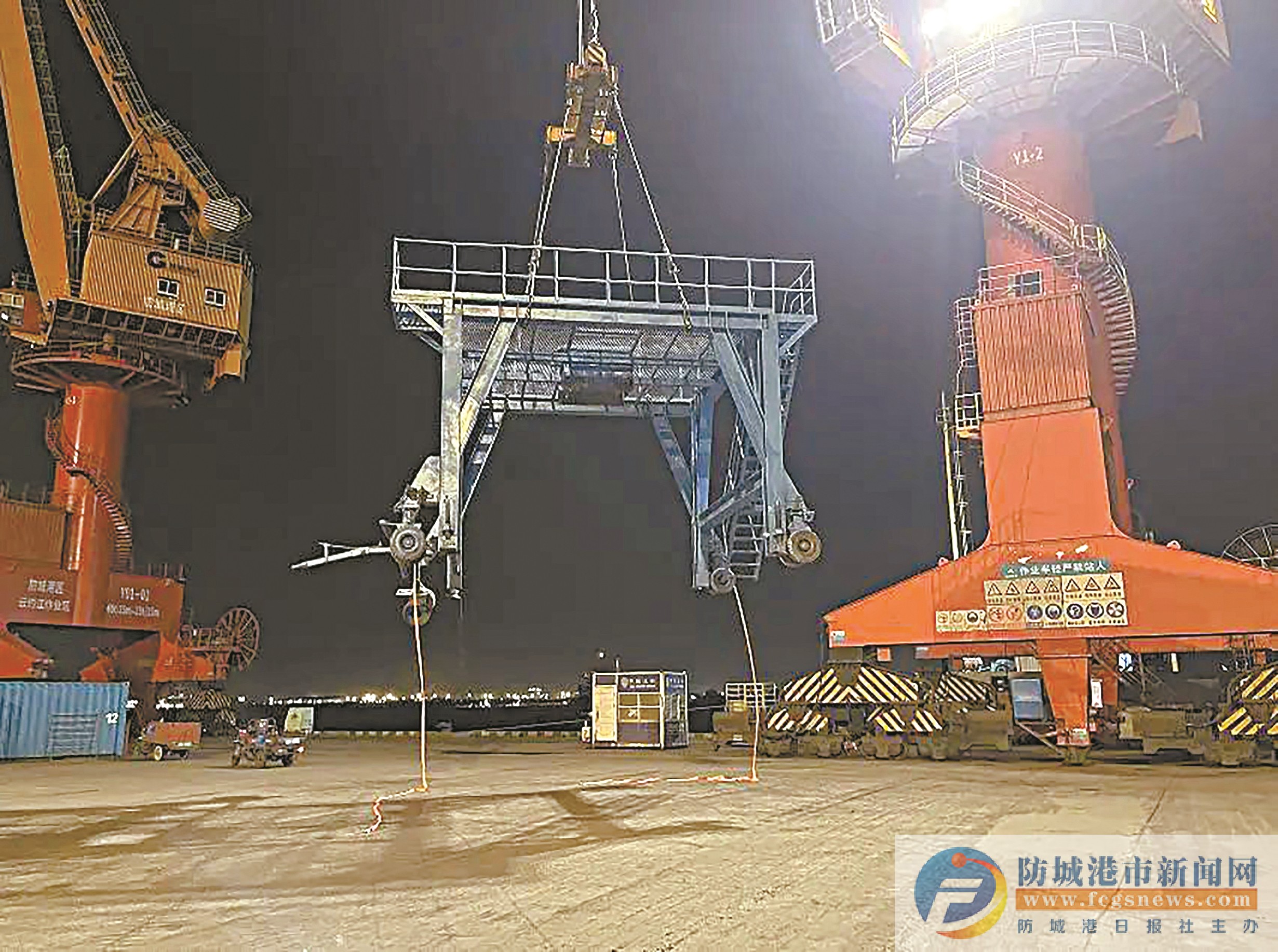 近日,防城港码头多部门协同配合,通过海运集装箱的方式,成功将一座自重约30吨的高架漏斗从18号泊位转运至云约江1号泊位,全程用时4.5小时。