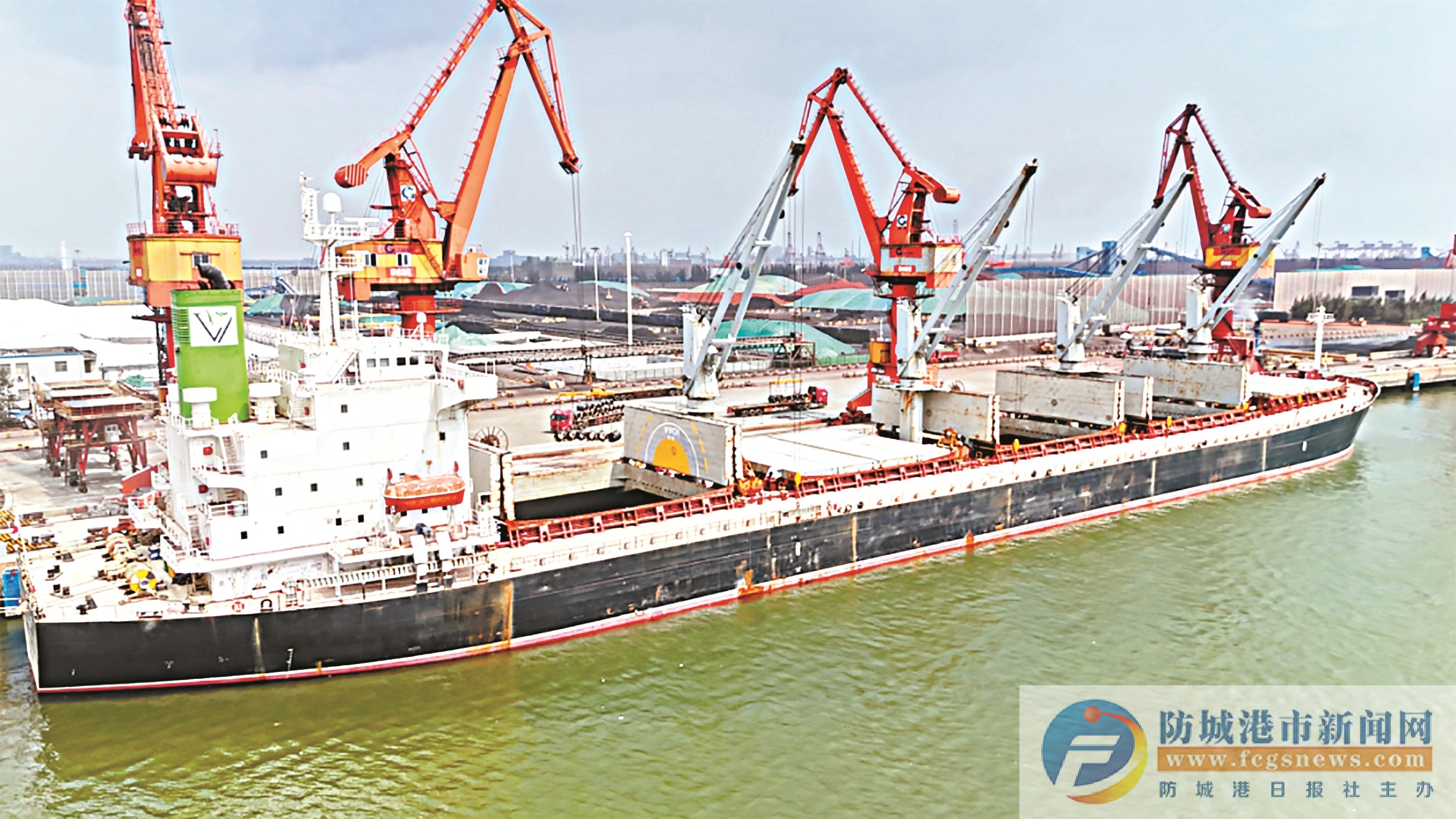 近日,防城港码头首次使用“一字吊梁”工艺完成盘螺货物装船出口任务。