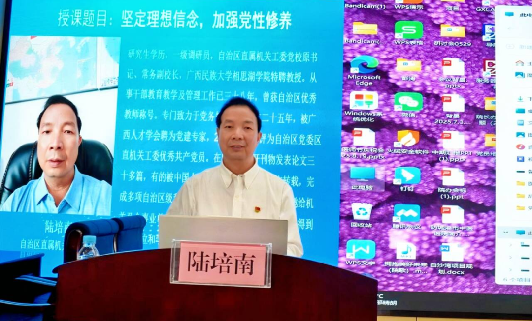 自治区直属机关工委党校教授陆培南作《坚定理想信念,加强党性修养》专题授课。