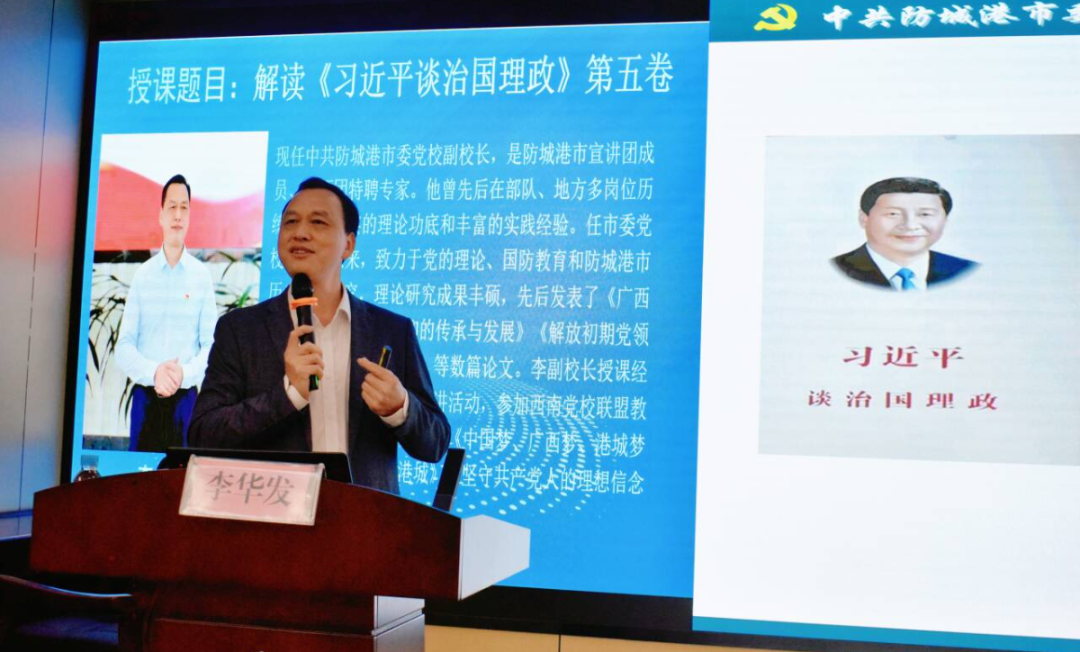 防城港市委党校副校长李华发作《解读<习近平谈治国理政>第五卷》专题授课。