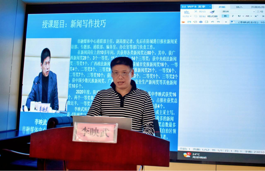 防城港市融媒体中心通联部主任、副高级记者李映武作《新闻写作技巧》专题授课。
