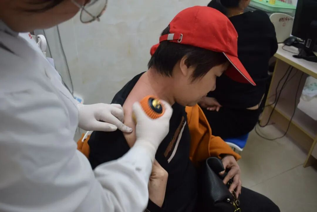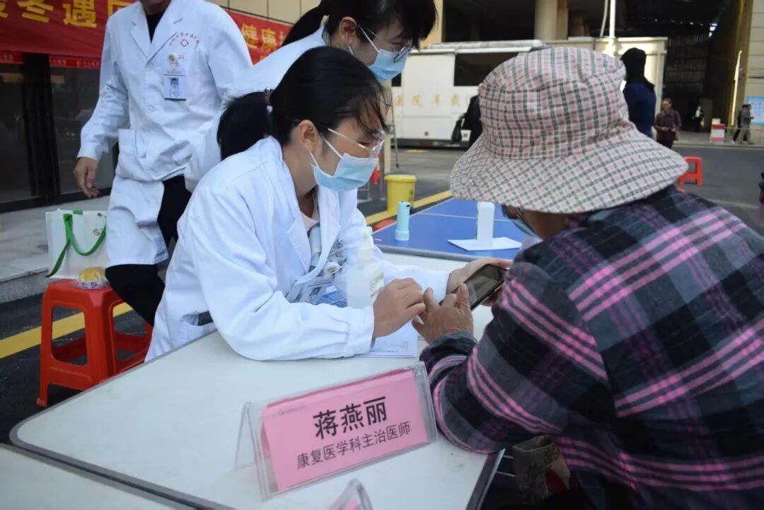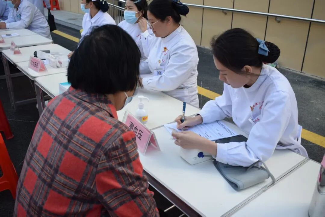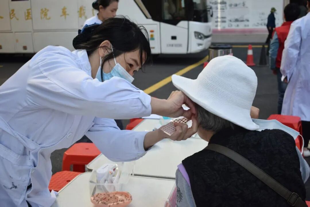 医护人员有序为居民免费测量血压、血糖,并提供火龙罐、耳穴压豆等中医特色疗法体验。