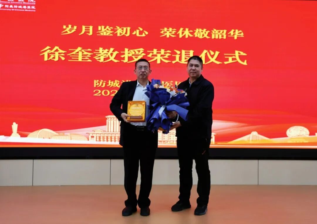 随后,戴三军主任为徐奎教授颁发荣退纪念章和鲜花,一份份荣誉承载着岁月的荣光,更凝聚着对这位老中医的崇高敬意。在全场期待的目光中,医院院长唐宏亮为徐奎教授颁发返聘聘书,正式聘请其为名医工作室领衔人岗位,标志着徐教授将继续以智慧与经验助力医院高质量发展。