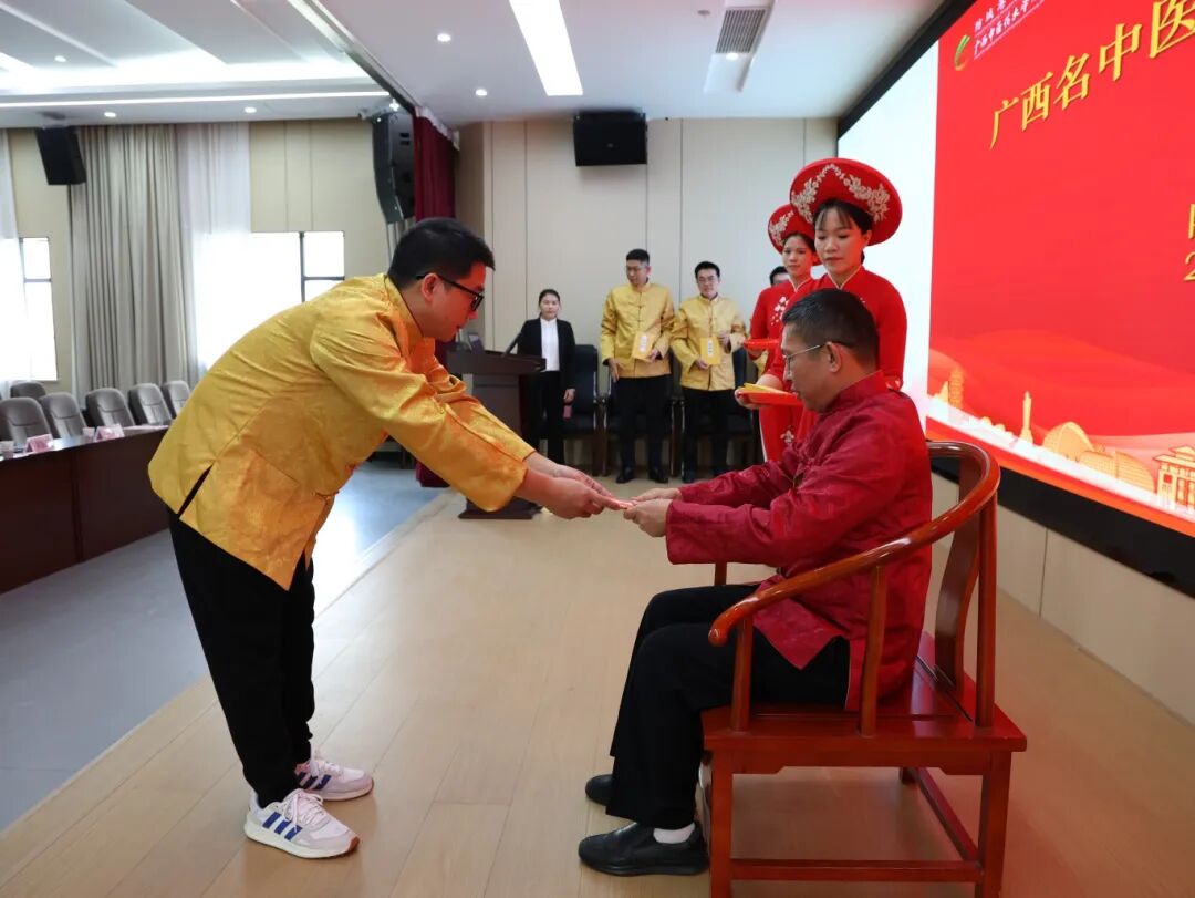 仪式的核心环节——收徒拜师礼,将现场氛围推向高潮。在主持人赵权副书记的引导下,5位青年医师张贵文、朱新亮、陈海棠、杨桂斌、周阳江列队肃立,向徐奎教授行三鞠躬大礼:一鞠躬敬师道尊严,二鞠躬传岐黄薪火,三鞠躬济天下苍生。鞠躬礼毕,青年医师们依次上前,恭敬地献上拜师帖与拜师茶,一声清脆的“师父”,承载着求学的赤诚与传承的决心,也让师徒情谊在这一刻正式缔结。