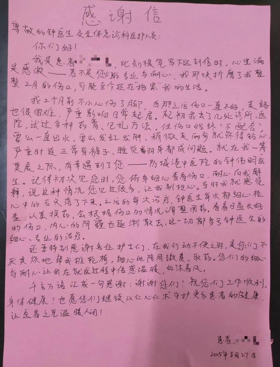 近日,防城港中医医院急诊医学科收到一封来自患者裴先生的感谢信,字里行间满是裴先生对我院急诊医学科钟伟明医生及全体医护人员的感激之情,这封手写感谢信讲述了一段医护人员用专业与温情帮助患者摆脱伤痛的暖心故事。