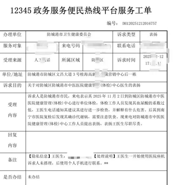 为此,他专门致电12345政务服务便民热线,对王医生尽职尽责的工作态度提出表扬。