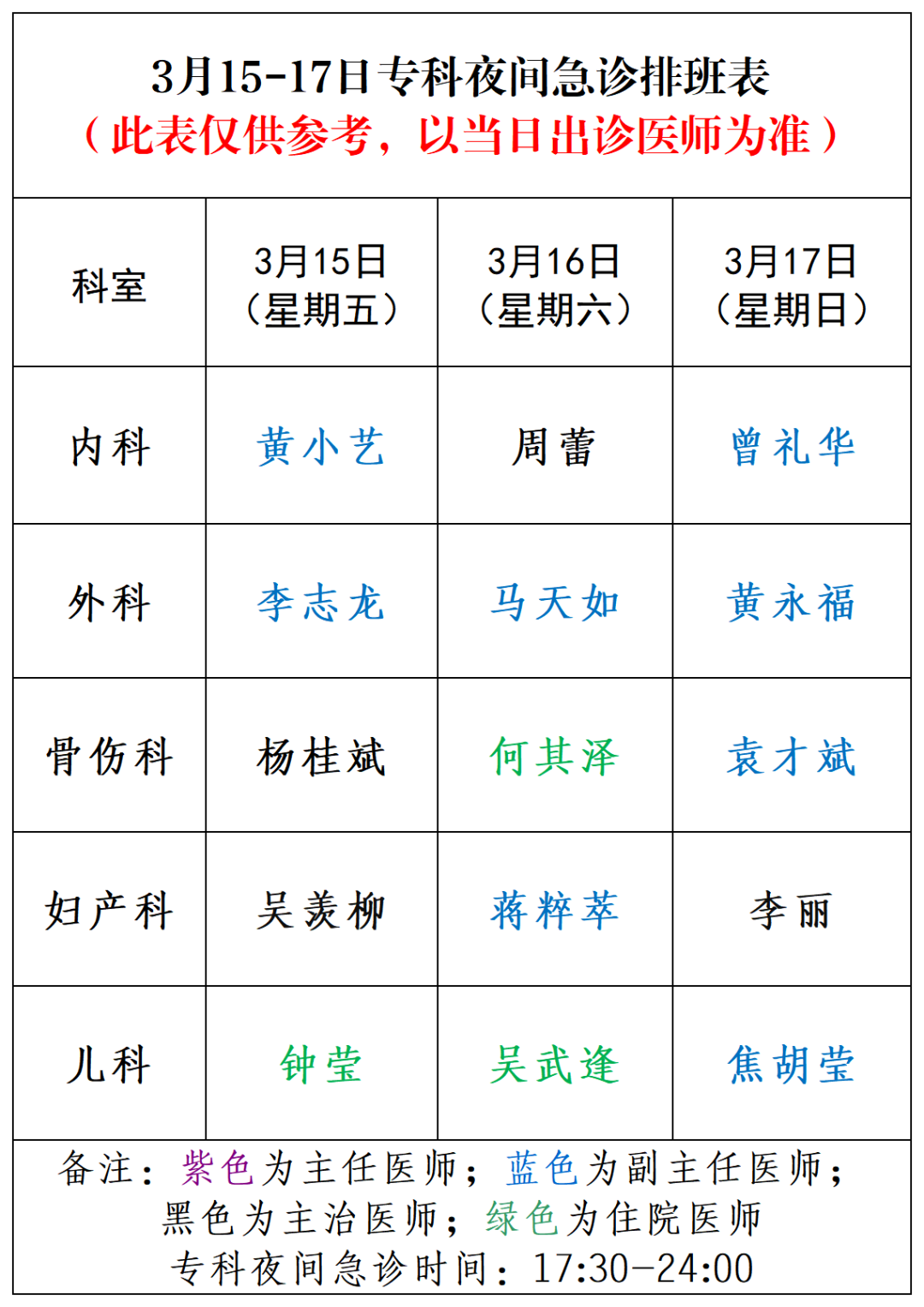 专科夜间急诊丨3月15-17日出诊医师排班表