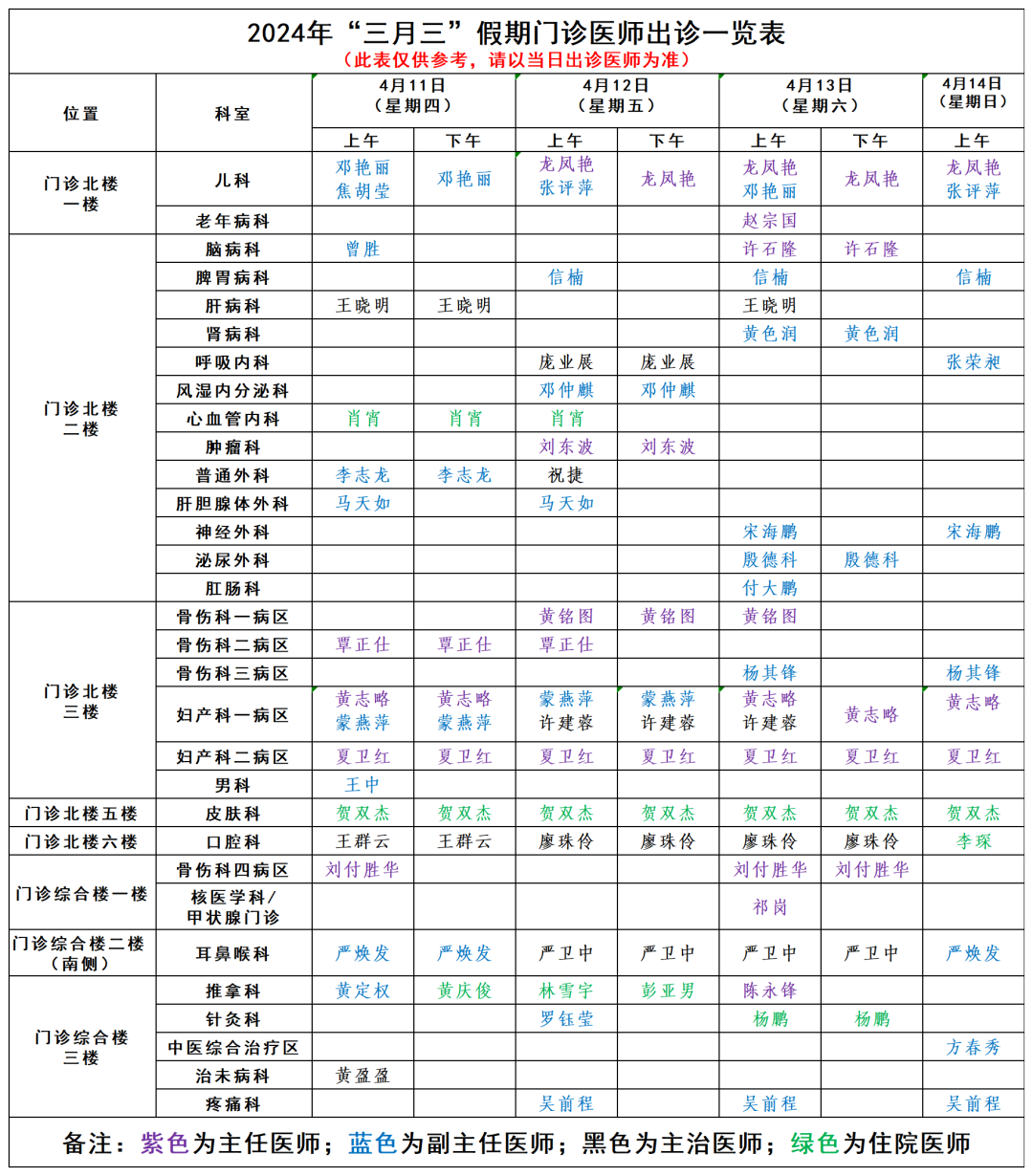 4月11日(星期四)——4月13日(星期六)全天开诊;