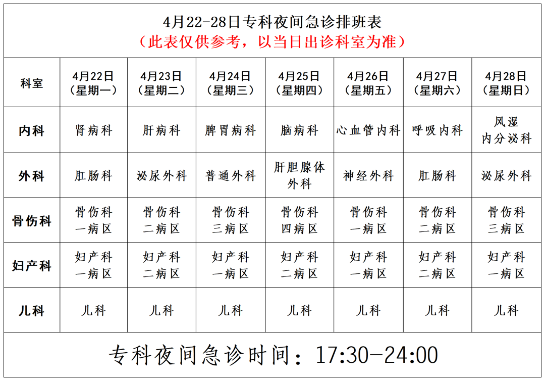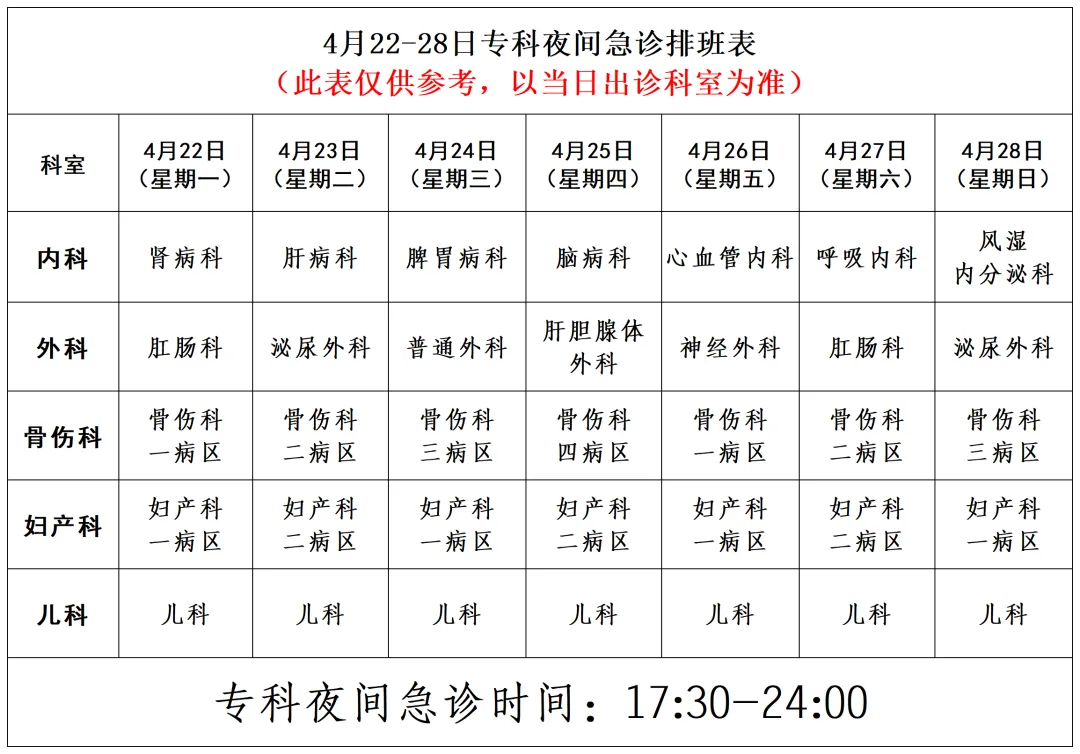 我院4月22-28日专科夜间急诊出诊科室排班表