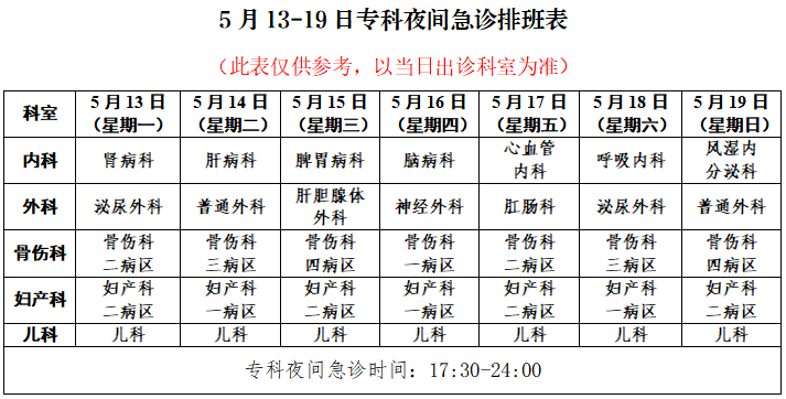我院5月13-19日专科夜间急诊出诊科室排班表